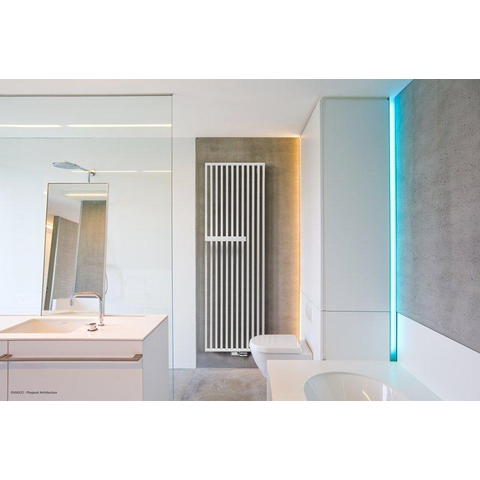 Le design vertical avec tubes rectangulaires confère à votre salle de bains une allure architecturale. Les tubes sont raccordés entre eux de façon continue, ce qui crée un ensemble sobre et haut de gamme sans cordons de soudure gênants. La finition blanche (comparable au RAL 9016 blanc signalisation) se marie facilement avec quasiment tous les carrelages, revêtements de sol ou styles de meubles : du blanc brillant au béton ciré ou aux tons bois. La fixation minimaliste est réalisée dans la même couleur que le radiateur, de sorte que la fixation se fond presque dans le mur et que le design attire tous les regards. Vous n’installez donc pas simplement un chauffage, mais un élément élégant qui rehausse visuellement l’ensemble de votre salle de bains.