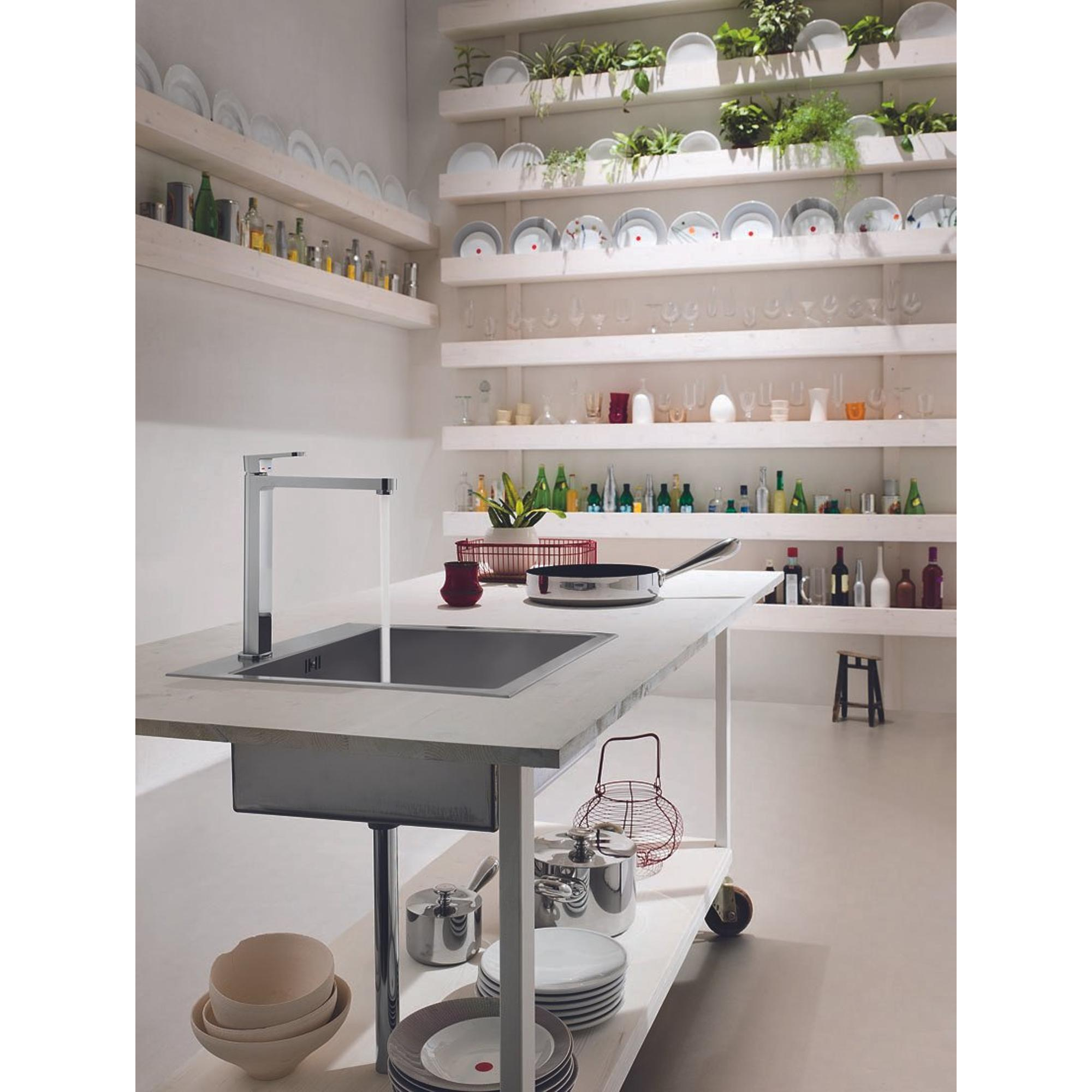 La finition de couleur chrome donne à votre cuisine une apparence lumineuse et luxueuse qui se marie parfaitement avec les appareils en acier inoxydable ainsi qu’avec des plans de travail clairs ou foncés. Le chrome reflète subtilement la lumière, ce qui donne à votre cuisine une impression de fraîcheur et d’espace. De plus, c’est un choix de style sûr si vous souhaitez concevoir votre cuisine pour l’avenir : le chrome ne se démode pratiquement jamais et se combine facilement avec différentes tendances de cuisine. Que vous optiez pour un minimalisme moderne, une ambiance champêtre ou un look industriel robuste, ce robinet s’y adapte sans effort et constitue un accent élégant près de votre évier.