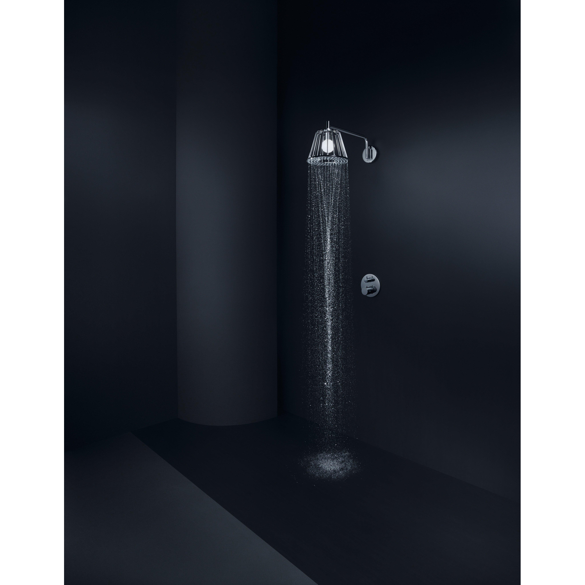 Ce n’est pas qu’une simple douche : c’est un objet design qui donne une identité unique à votre espace douche. La douche de tête ronde et plate de 27,5 cm est conçue comme une élégante lampe, avec éclairage LED intégré. Vous créez ainsi pendant la douche un faisceau lumineux d’ambiance qui semble presque faire “briller” l’eau. Le bras de douche fin de 38 cm positionne harmonieusement la douche de tête au centre de l’espace douche et assure un look équilibré contre le mur. La finition chrome brillant s’accorde parfaitement avec les autres robinets et accessoires chromés, ce qui vous permet de créer facilement un ensemble harmonieux. Idéal comme point de mire dans une salle de bains design, mais aussi étonnamment beau dans un espace calme et minimaliste avec blanc et pierre naturelle.