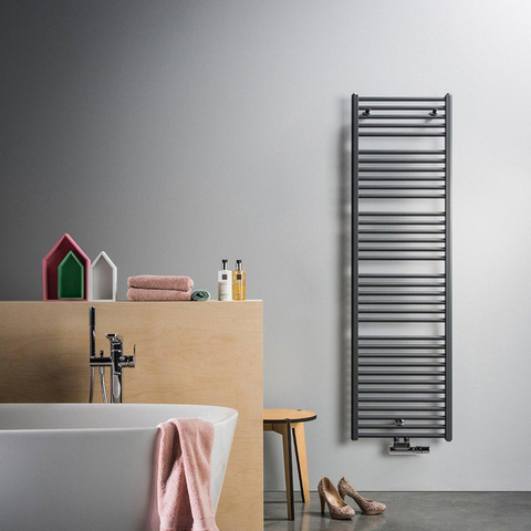 Les tubes ronds associés aux collecteurs en forme de D confèrent à ce radiateur de salle de bains un caractère raffiné et intemporel. Grâce aux lignes horizontales, l’ensemble crée un aspect calme sur le mur, ce qui lui permet de s’intégrer harmonieusement tout en restant présent comme élément design luxueux. La finition est de haute qualité, avec des soudures invisibles qui soulignent le savoir-faire et assurent un ensemble épuré sans transitions gênantes. La couleur anthracite s’intègre parfaitement dans les salles de bains industrielles, modernes et au style hôtel chic, et se marie à merveille avec des robinets noirs, des carreaux effet béton ou au contraire avec une robinetterie et un sanitaire blancs classiques. Vous ajoutez ainsi en une seule fois chaleur et design à votre espace.