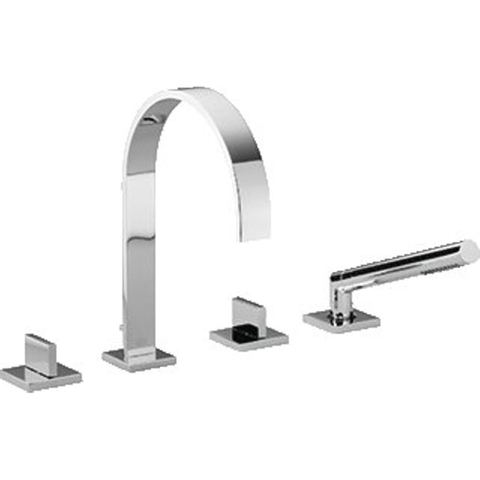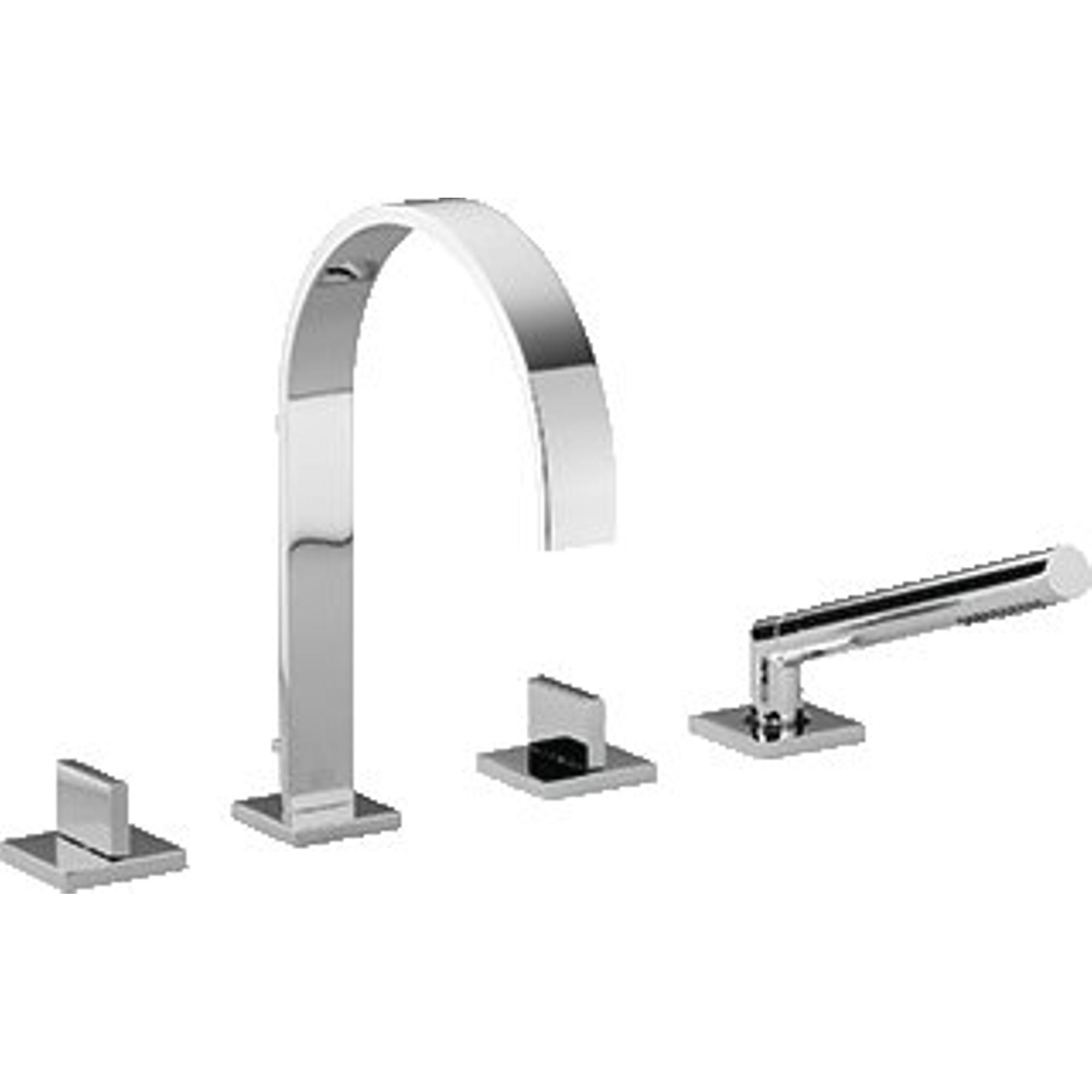 - Mitigeur de bord de baignoire 4 trous avec bec fixe, commande, inverseur et douchette à main bâton dans un design harmonieux
