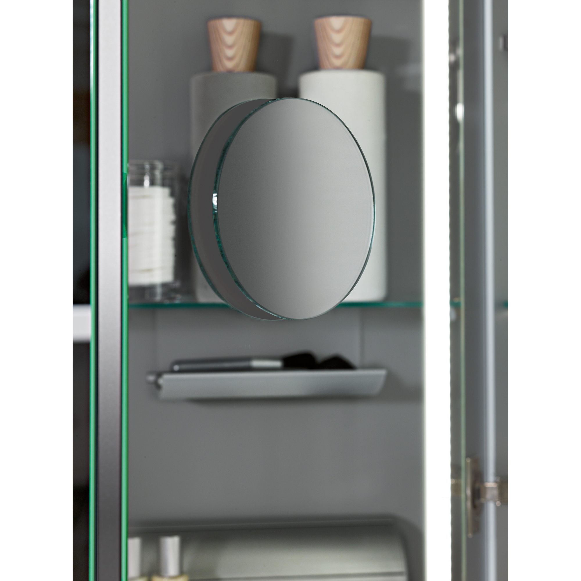 Derrière les portes miroir double face, vous trouverez un aménagement intérieur clair dont vous remarquerez immédiatement la praticité au quotidien. Des étagères pratiques offrent de la place pour tous vos produits de soin, tandis que le plateau intégré est idéal pour les articles que vous utilisez souvent. Le miroir grossissant aide pour les travaux de précision tels que l’épilation ou l’application du maquillage, sans que vous ayez besoin de poser des accessoires séparés. La prise intégrée est particulièrement pratique pour recharger une brosse à dents électrique ou brancher un sèche-cheveux ou un rasoir. La barre magnétique offre en outre un emplacement ingénieux pour les petits outils métalliques, de sorte que tout reste clair et à portée de main.