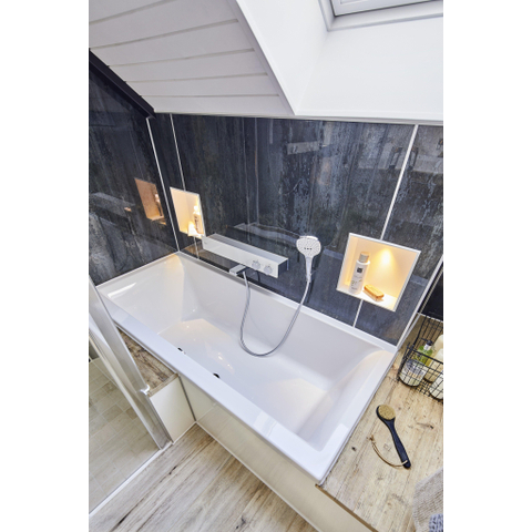 La douchette offre trois types de jets différents : un jet de pluie puissant, un jet de pluie doux et plein, et un jet de massage intensif. Avec le bouton Select pratique, vous changez facilement entre ces modes, afin de toujours choisir le jet parfait selon votre humeur et vos besoins. Le grand diamètre de la tête de douche assure un jet d'eau large qui vous enveloppe complètement, tandis que la facilité d'utilisation est au centre. Cela rend la douche non seulement confortable, mais aussi particulièrement agréable. Grâce aux fonctions intelligentes, vous gardez le contrôle et transformez chaque douche en une expérience de bien-être personnalisée.