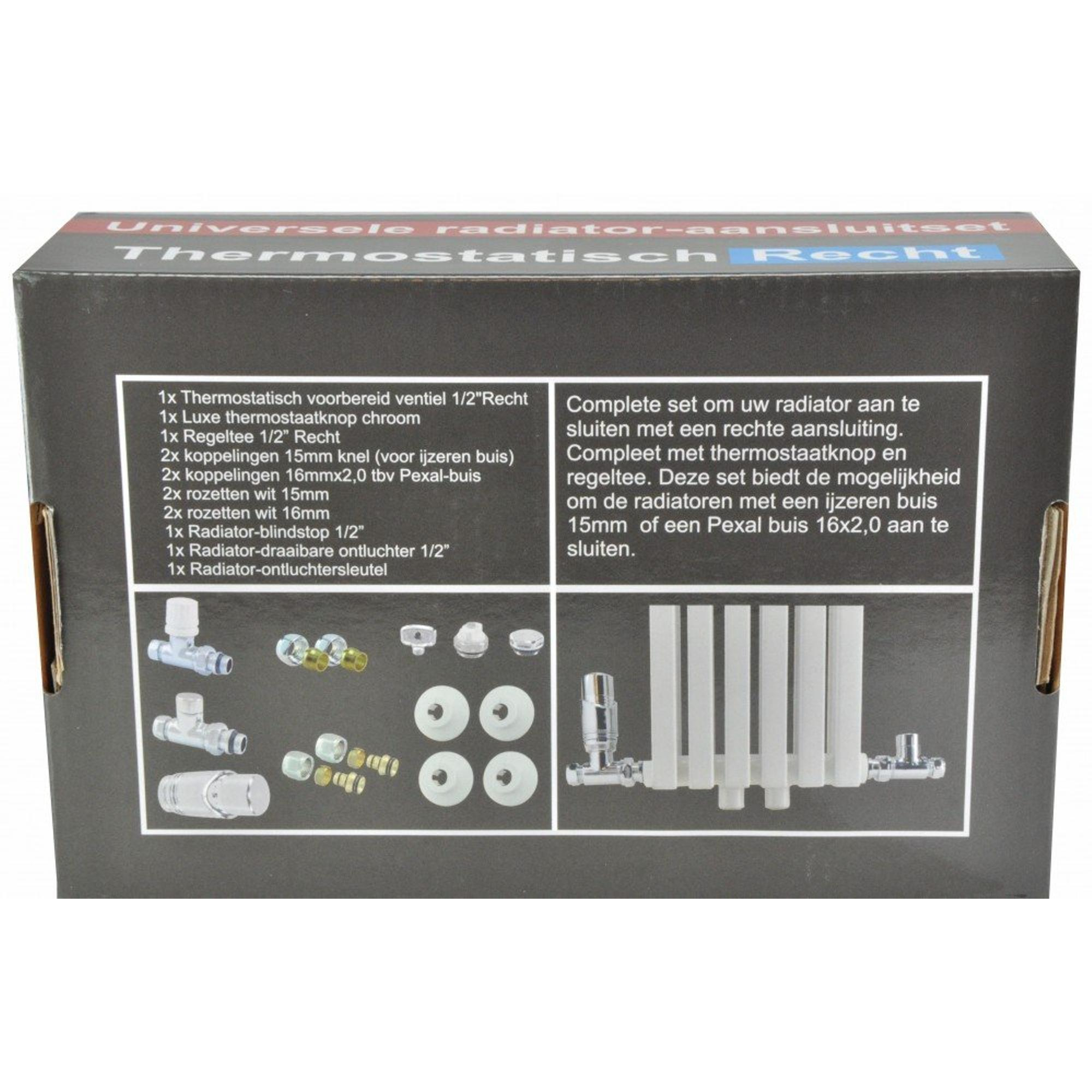 Ce kit de raccordement contient tout ce dont vous avez besoin pour un montage professionnel de votre radiateur. Des vannes thermostatiques de luxe en saillie aux robinets d’arrêt et purgeurs, chaque composant est soigneusement sélectionné pour faciliter votre installation. La version droite est spécialement conçue pour les conduites venant du sol, ce qui est fréquent dans les habitations modernes. Vous gagnez ainsi du temps et évitez des achats supplémentaires inutiles. Les rosaces de serrage fournies assurent également une finition soignée, pour que les raccordements aient un aspect professionnel.