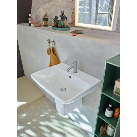 Ce lavabo rectangulaire est conçu pour s’adapter facilement à l’aménagement de votre salle de bains. Il convient pour un montage mural avec des boulons d’ancrage, mais peut aussi être combiné avec une colonne, un cache-siphon ou un meuble de salle de bains. Vous pouvez ainsi varier d’un look minimaliste et aérien à une apparence plus meuble avec espace de rangement supplémentaire. Le dosseret intégré assure une finition soignée contre le mur et aide à limiter les éclaboussures. La couleur blanche neutre se combine facilement avec une large gamme de robinets et d’accessoires, du chrome au noir mat ou au métal brossé. Grâce au design intemporel, il s’agit d’un choix esthétique et sûr avec lequel vous pourrez également continuer à évoluer lors de futurs restylings de votre salle de bains.