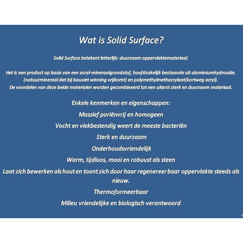 Le matériau Solid Surface est connu pour son apparence épurée, sa qualité massive et sa facilité d’entretien. Il est lisse et agréable au toucher, donne une impression de qualité supérieure et est parfaitement adapté à une utilisation quotidienne intensive. Les petites traces d’usage peuvent souvent être facilement corrigées, de sorte que votre vasque reste belle pendant de nombreuses années. Combinée à la finition brillante, le nettoyage est simple : un chiffon doux et un détergent doux suffisent généralement pour éliminer les dépôts de calcaire et les résidus de savon. Votre lavabo reste ainsi non seulement hygiénique, mais aussi durablement présentable – idéal si vous accordez de l’importance à la fois au design et à la durabilité.