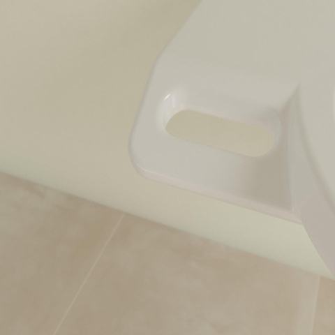 Ce lavabo a été conçu avec l’accessibilité comme point de départ, sans compromis sur le style. Comme il est entièrement accessible en partie inférieure, l’espace sous le lavabo reste libre, ce qui vous permet d’y accéder facilement avec un fauteuil roulant, un tabouret ou une chaise. Les poignées intégrées de chaque côté de la cuve offrent un soutien supplémentaire pour se lever ou se déplacer, ce qui est rassurant dans un environnement où le sol peut rapidement devenir glissant. La forme ovale et arrondie réduit le risque de chocs et assure en même temps une apparence chaleureuse. Il s’agit donc d’une solution idéale si vous souhaitez rendre votre salle de bains adaptée à toutes les étapes de la vie ou si vous avez besoin d’un espace sûr et confortable pour l’aide informelle ou les soins professionnels.