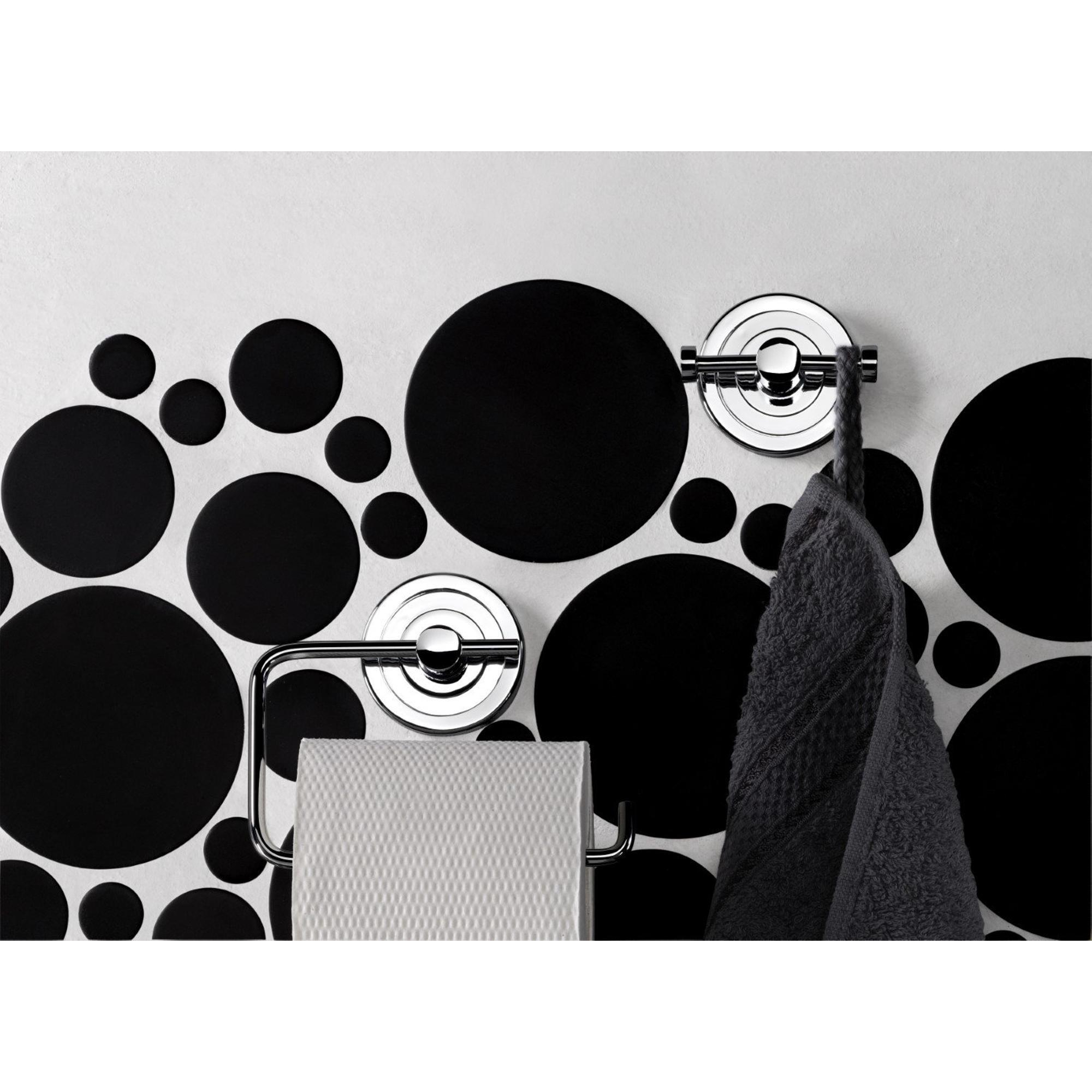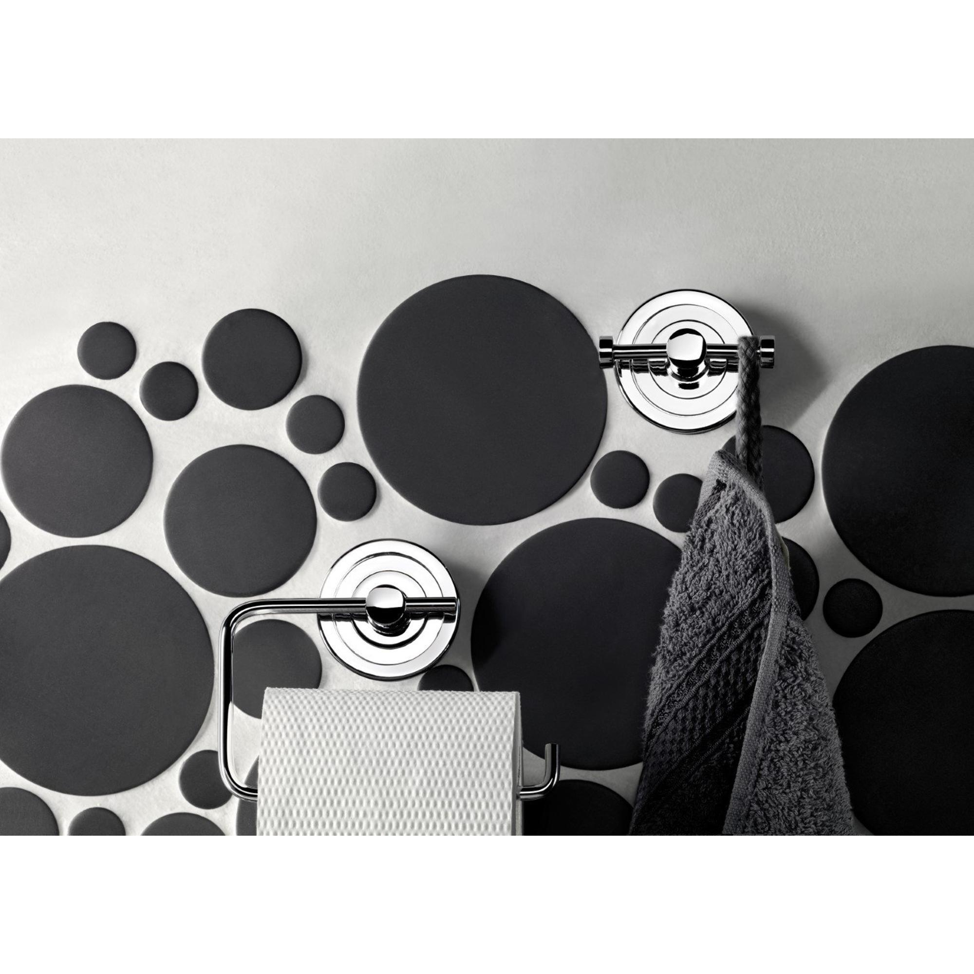 Le design moderne et épuré, avec tube rond et rosace ronde, s'harmonise parfaitement avec les salles de bains contemporaines dotées de robinets et d'accessoires chromés. La finition chromée à haut brillant confère un aspect luxueux et reflète joliment la lumière, ce qui donne à la pièce une apparence plus fraîche et visuellement plus spacieuse. Grâce à la fixation dissimulée, vous ne voyez ni vis ni chevilles ; la fixation est proprement dissimulée derrière la rosace de recouvrement ronde. Cela crée un ensemble soigné et haut de gamme. Combinez ce crochet avec d'autres accessoires de même style pour un look cohérent et apaisant dans votre salle de bains, des anneaux porte-serviettes aux dérouleurs de réserve pour rouleaux de papier toilette.