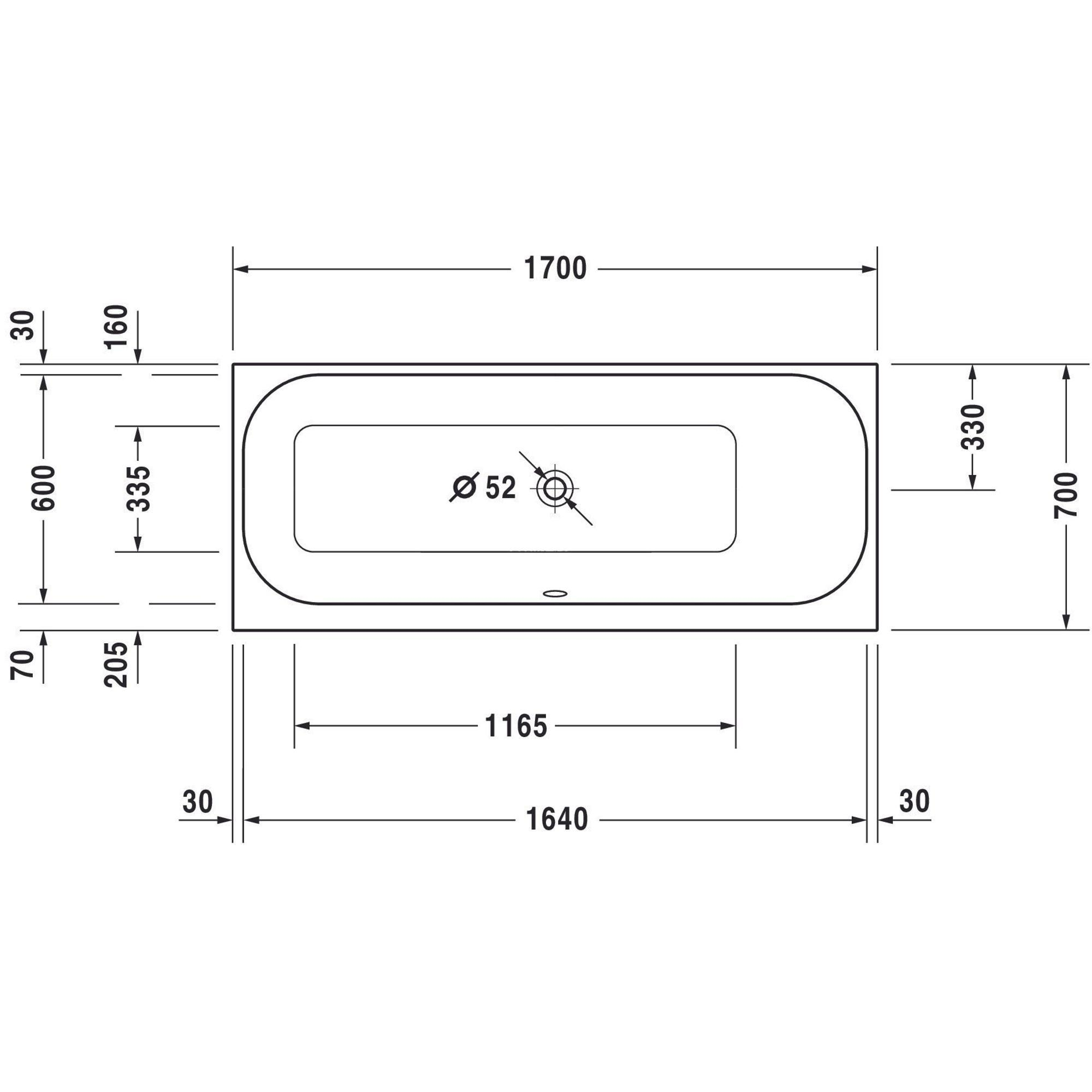 Duravit HappyD 2 baignoire encastrée en matière synthétique acrylique rectangulaire avec soutien dorsal à droite 170x70x46cm sans pieds blanc