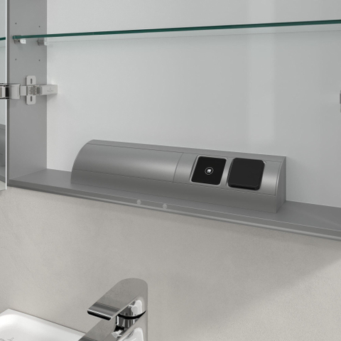 - Prise de courant intégrée dans l’armoire, idéale pour recharger les brosses à dents, les rasoirs ou brancher un sèche-cheveux