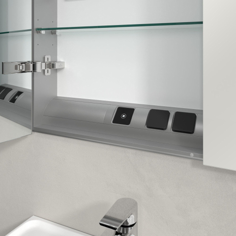 L’éclairage LED intégré est incorporé dans les portes miroir, de sorte que votre visage est uniformément éclairé sans ombres gênantes. À l’aide de l’interrupteur à capteur, vous réglez très facilement la luminosité et la couleur de la lumière : choisissez une lumière blanche lumière du jour lorsque vous souhaitez vous maquiller ou vous raser avec une précision maximale, ou passez au blanc chaud pour créer le soir un éclairage d’ambiance relaxant. L’éclairage est dimmable en trois étapes, de sorte que vous ayez toujours la lumière adéquate pour chaque moment. La technologie LED est économe en énergie et durable, ce qui est non seulement bénéfique pour l’environnement mais aussi pour votre facture d’électricité. Vous profitez ainsi au quotidien d’un éclairage de miroir fonctionnel et d’un éclairage d’ambiance, sans devoir installer de luminaires supplémentaires au-dessus du miroir.