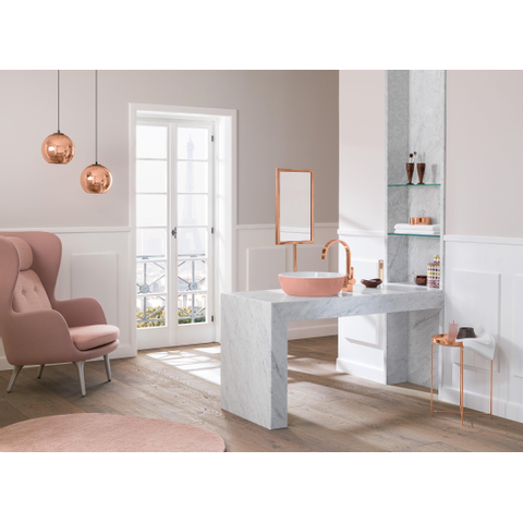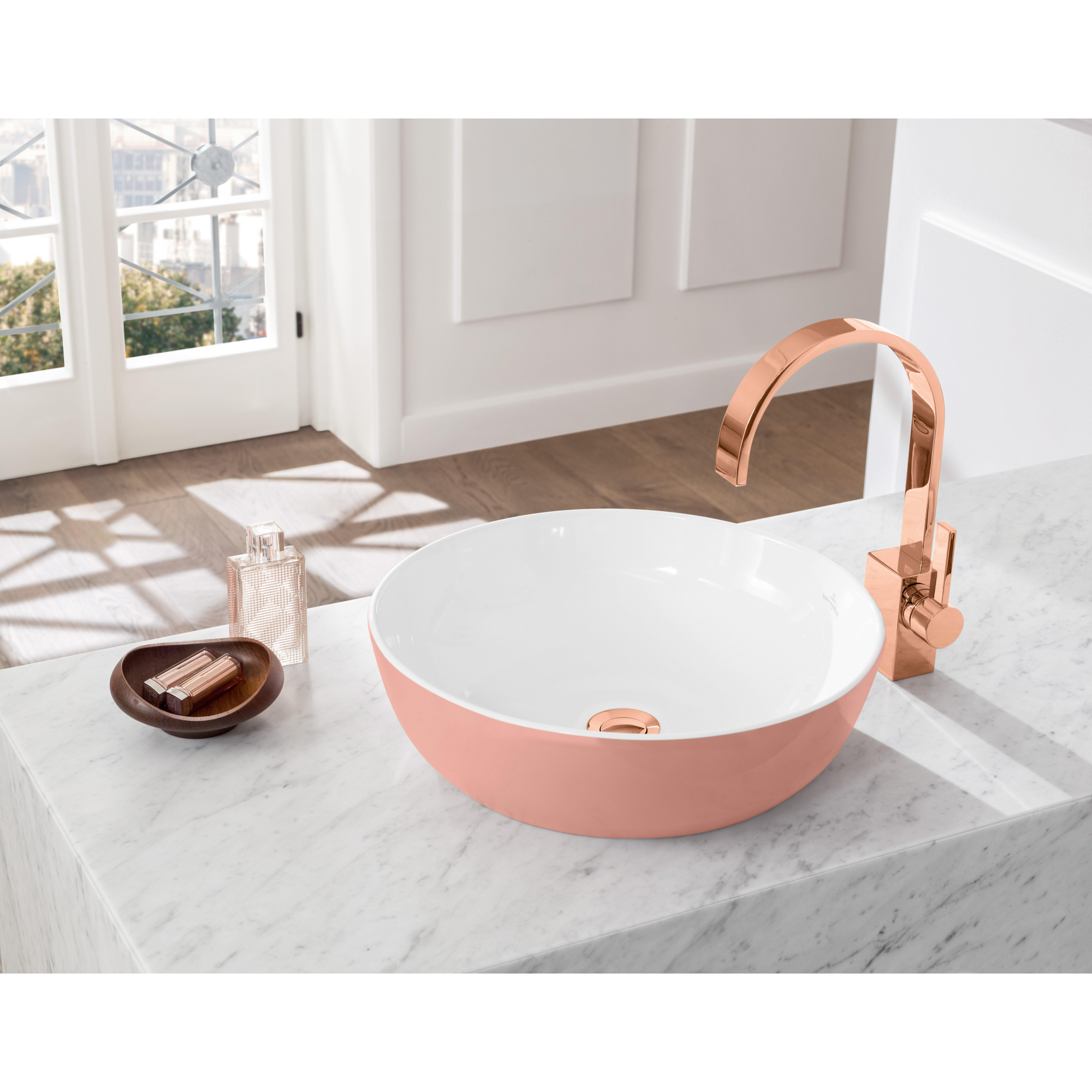La forme ronde d’un diamètre d’environ 43 cm et les bords remarquablement fins donnent immédiatement à votre salle de bains une allure moderne, presque flottante. L’extérieur dans la couleur douce powder apporte une touche chaleureuse et contemporaine, tandis que l’intérieur reste d’un blanc éclatant pour un aspect frais et intemporel. Ce look BiColour a été développé par la designer Gesa Hansen et s’accorde parfaitement avec les tendances d’intérieur actuelles où la couleur revient de manière subtile. Associez la vasque à poser à une tablette de lavabo minimaliste, à un mitigeur sur gorge ou mural élancé et à un miroir assorti pour un ensemble harmonieux. Vous créez ainsi facilement un espace de toilette personnel et élégant qui donne l’impression d’un boutique-hôtel, mais simplement chez vous.