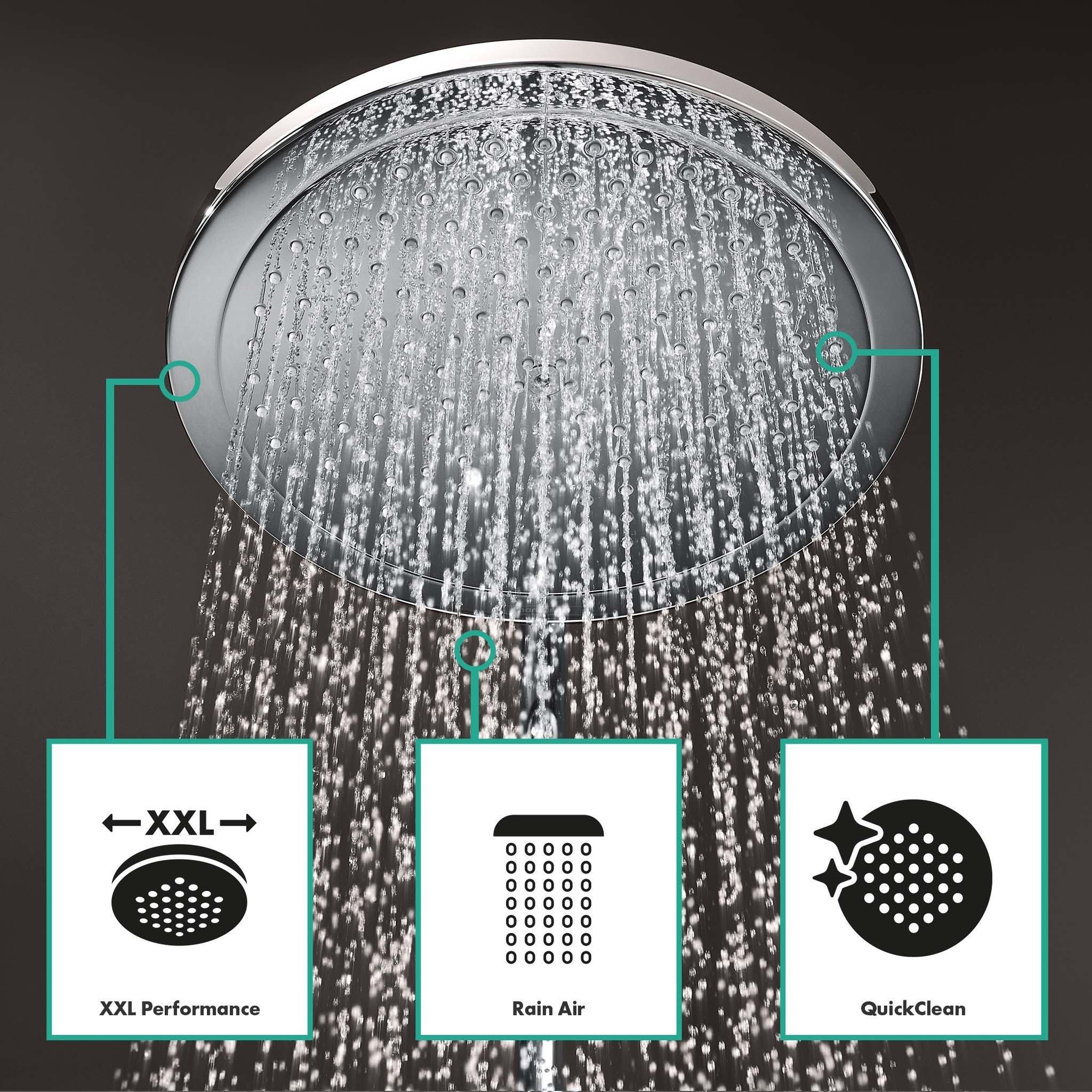 - Douchette principale de 280 mm avec jet RainAir pour des gouttes d'eau douces et pleines