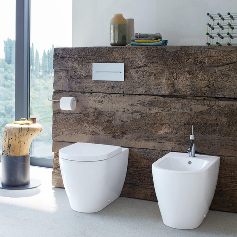 - Cuvette à poser back-to-wall : placée bien droite contre le mur pour un look ordonné et moderne.