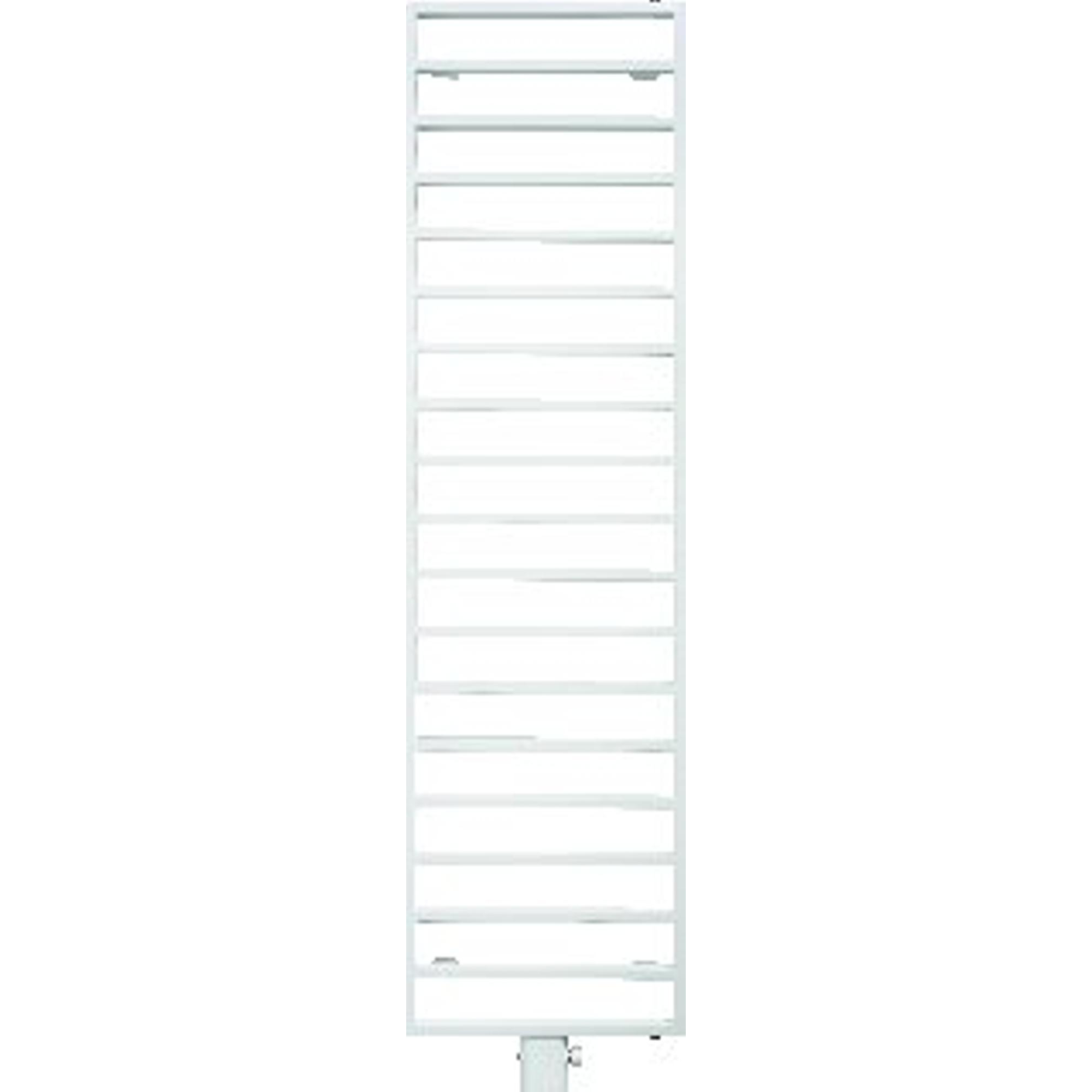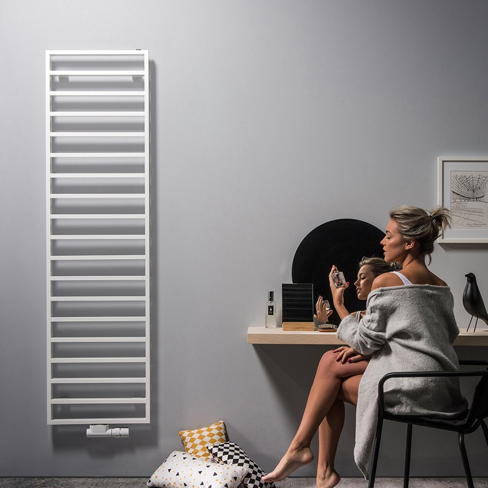 Le profil de tubes horizontal et rectangulaire donne immédiatement à votre salle de bains une allure haut de gamme et architecturale. La répartition rythmée des tubes crée un jeu de lignes apaisant, qui ressort particulièrement bien dans les salles de bains modernes aux formes droites et sans fioritures. La finition en blanc signalisation (RAL 9016) paraît fraîche et neutre, de sorte que ce radiateur se marie aisément aussi bien avec des meubles blancs qu’avec des nuances de bois, un aspect béton ou des carreaux foncés. Grâce à son profil relativement bas le long du mur, vous conservez un sentiment d’espace dans votre salle de bains : votre regard n’est pas interrompu par un bloc massif, mais glisse le long d’un objet design subtil. Vous ajoutez ainsi de la chaleur sans perturber l’équilibre du design de votre salle de bains.