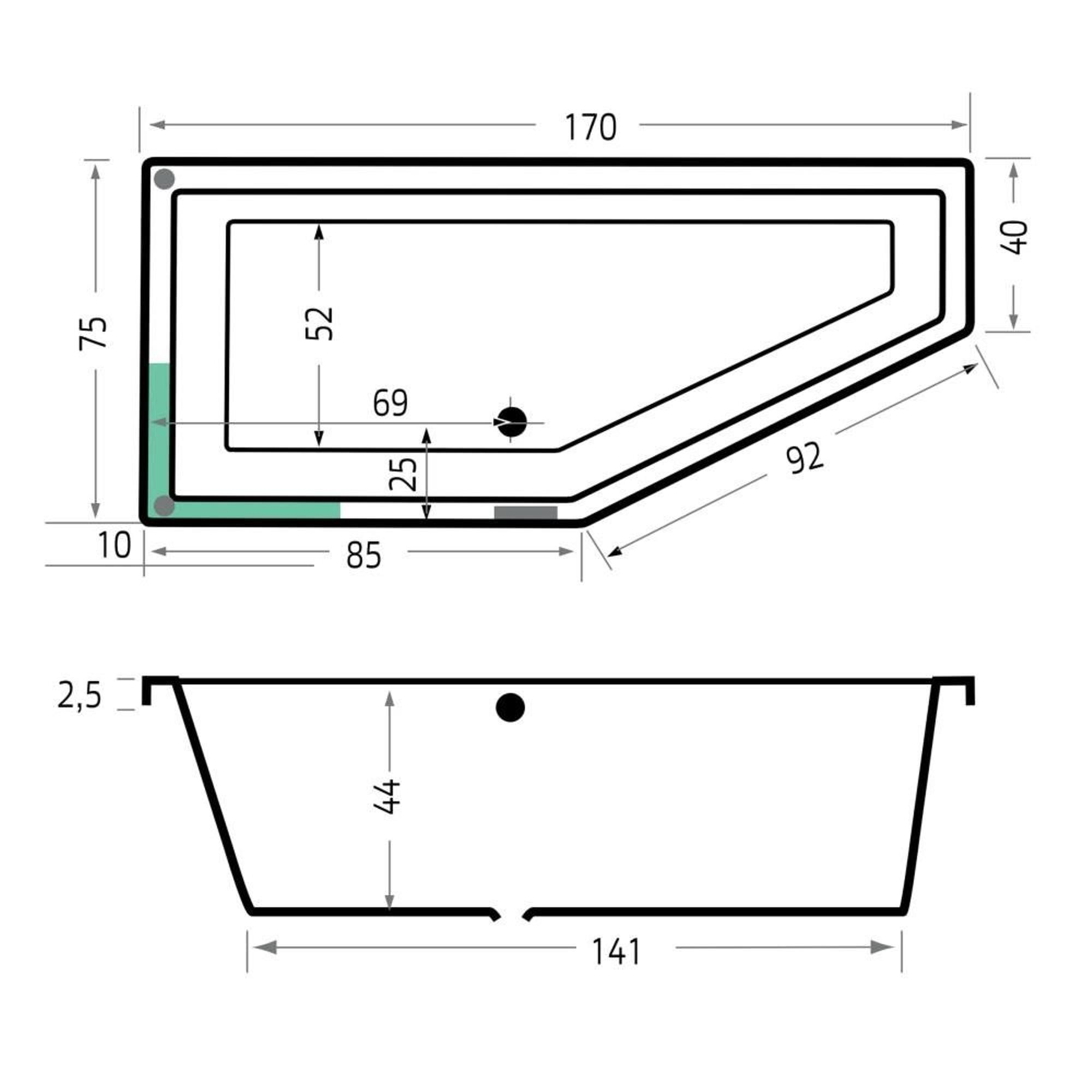 - Baignoire d’angle compacte de 170x75x48 cm, idéale pour les salles de bains petites à moyennes.