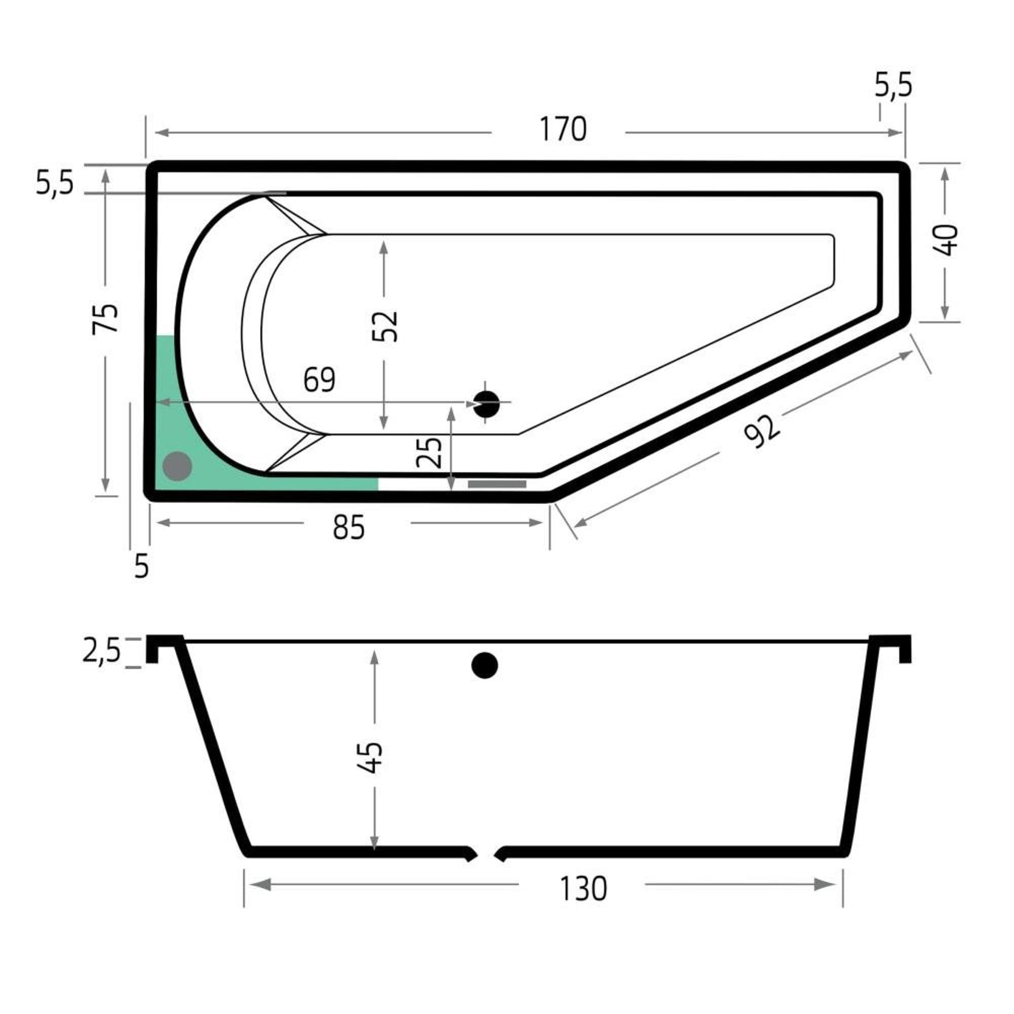 - Baignoire d'angle compacte de 170x75x48 cm, idéale pour les salles de bains petites et moyennes.
