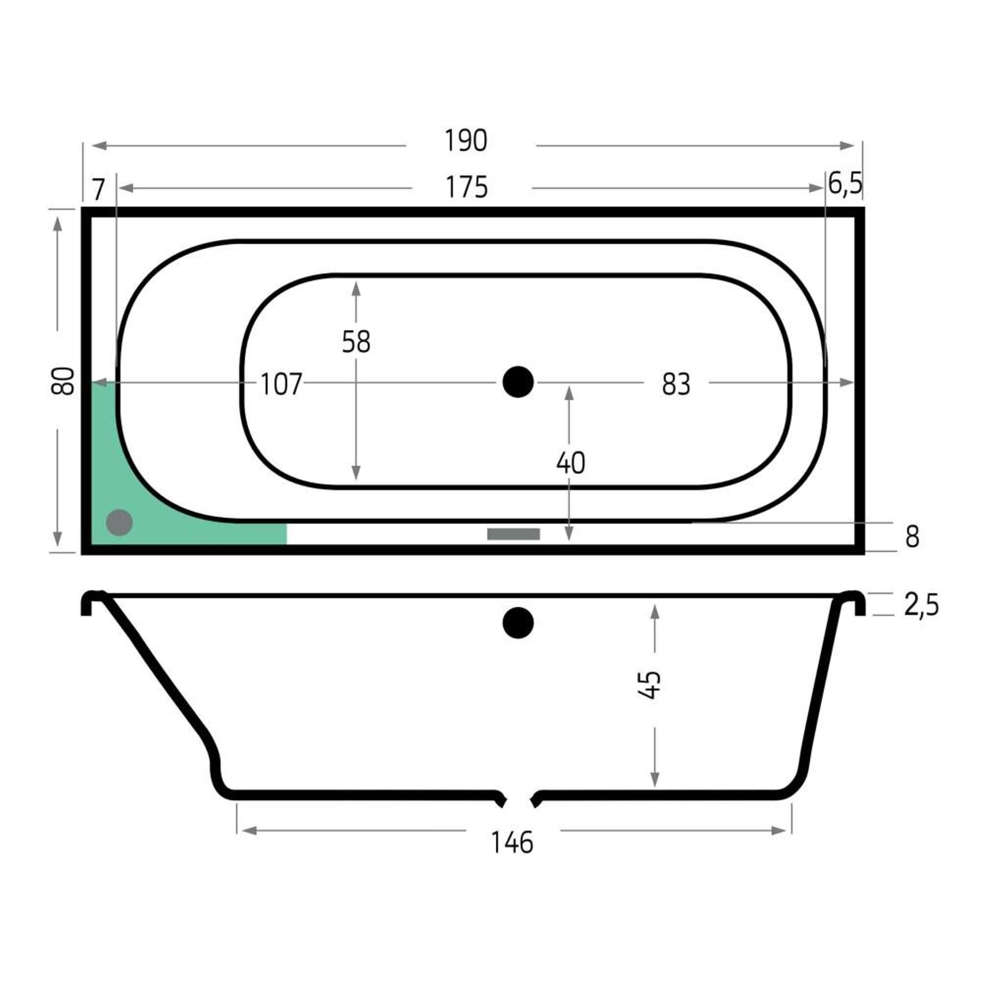 - Baignoire spacieuse de 190x80x48 cm, idéale pour s’allonger confortablement.