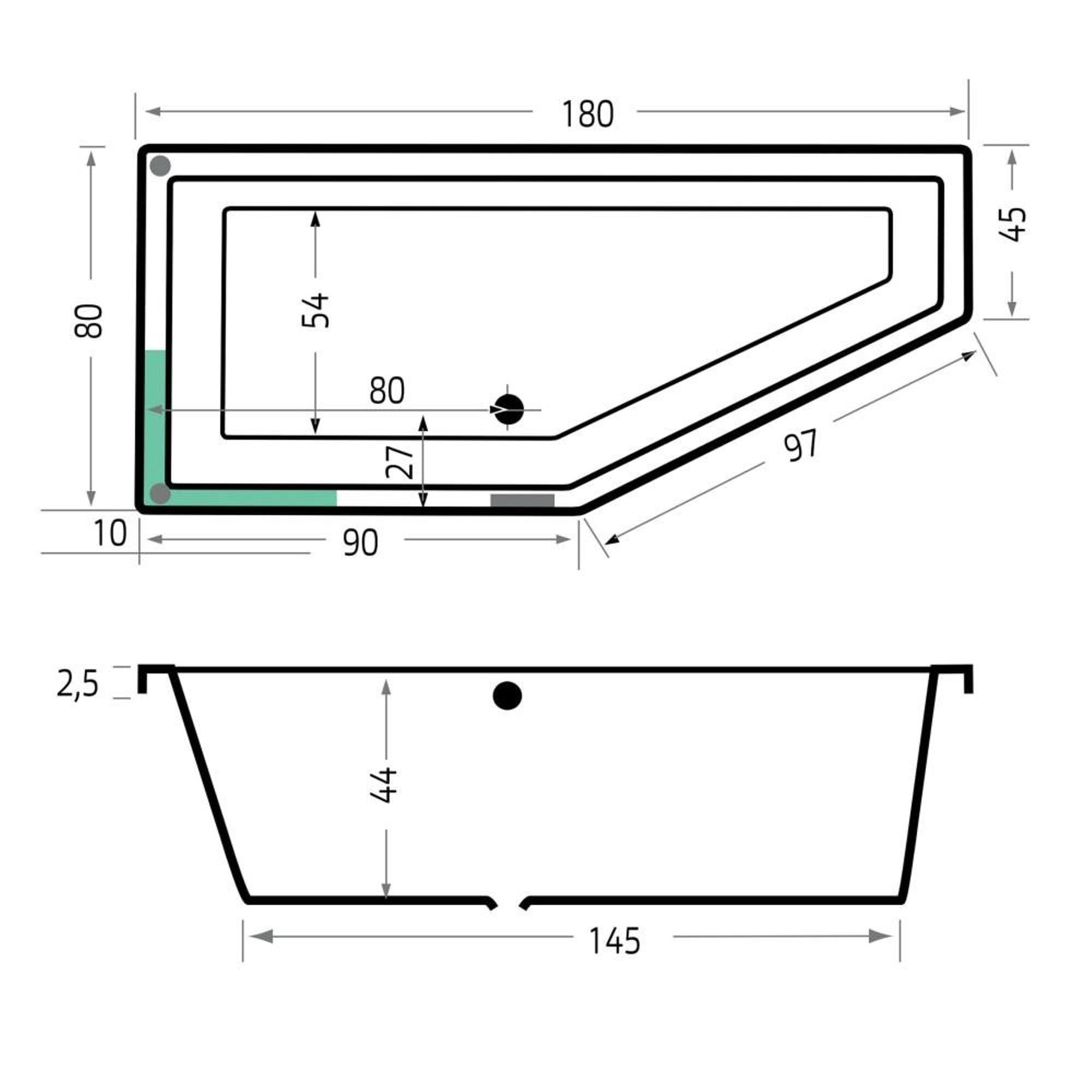 - Grande baignoire d’angle de 180x80x48 cm, idéale pour s’allonger confortablement.