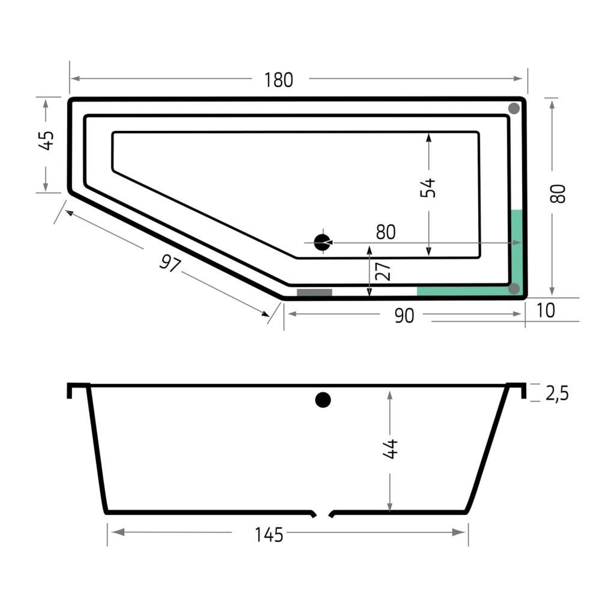 La forme pentagonale intelligente permet d’utiliser l’espace disponible beaucoup plus efficacement qu’avec une baignoire rectangulaire standard. Avec des dimensions de 180x80 cm et une hauteur d’environ 48 cm (cuve d’environ 44 cm de profondeur), elle offre un espace intérieur généreux, tandis que la forme extérieure s’aligne harmonieusement sur votre mur et votre ligne de sol. La version droite permet d’intégrer facilement la baignoire dans un aménagement de salle de bains comprenant douche, WC et lavabo autour. Vous créez ainsi une véritable baignoire dans une salle de bains où l’on ne s’y attendrait peut-être pas. La bonde centrale offre en outre une position assise et allongée agréable, car vous n’avez pas à vous allonger sur la bonde, ce qui est particulièrement appréciable si vous souhaitez utiliser la baignoire à deux ou si vous aimez changer de position.