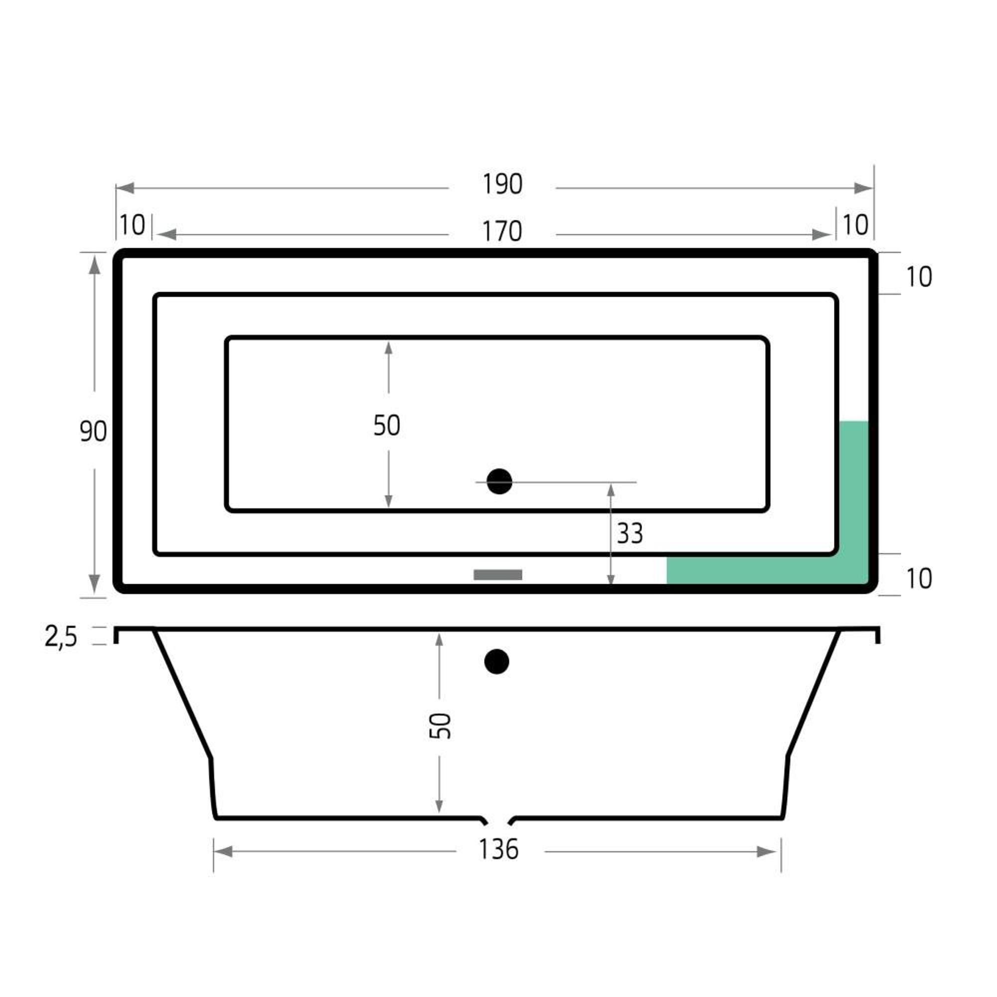 - Baignoire duo spacieuse de 190x90x53 cm pour un bain confortable pour une ou deux personnes.