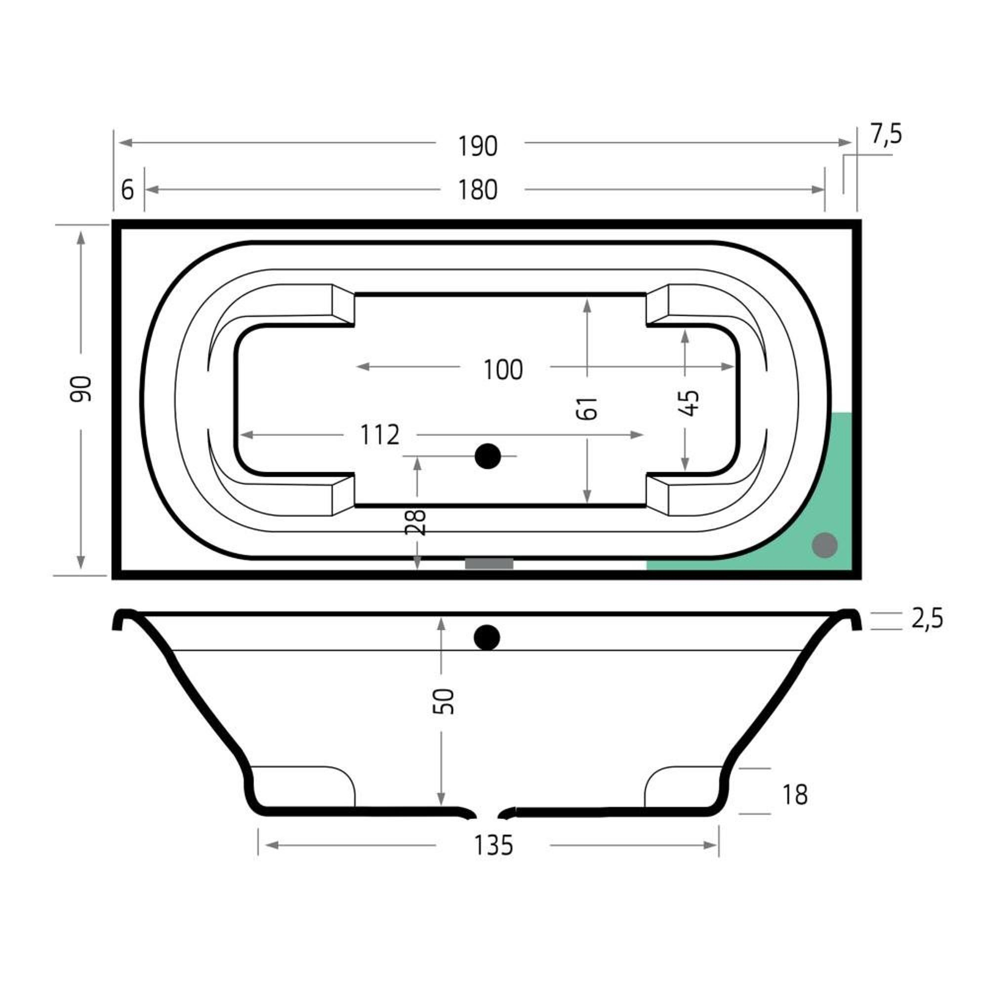 - Baignoire duo spacieuse de 190x90x53 cm, idéale pour se baigner à deux ou seul avec un confort supplémentaire.
