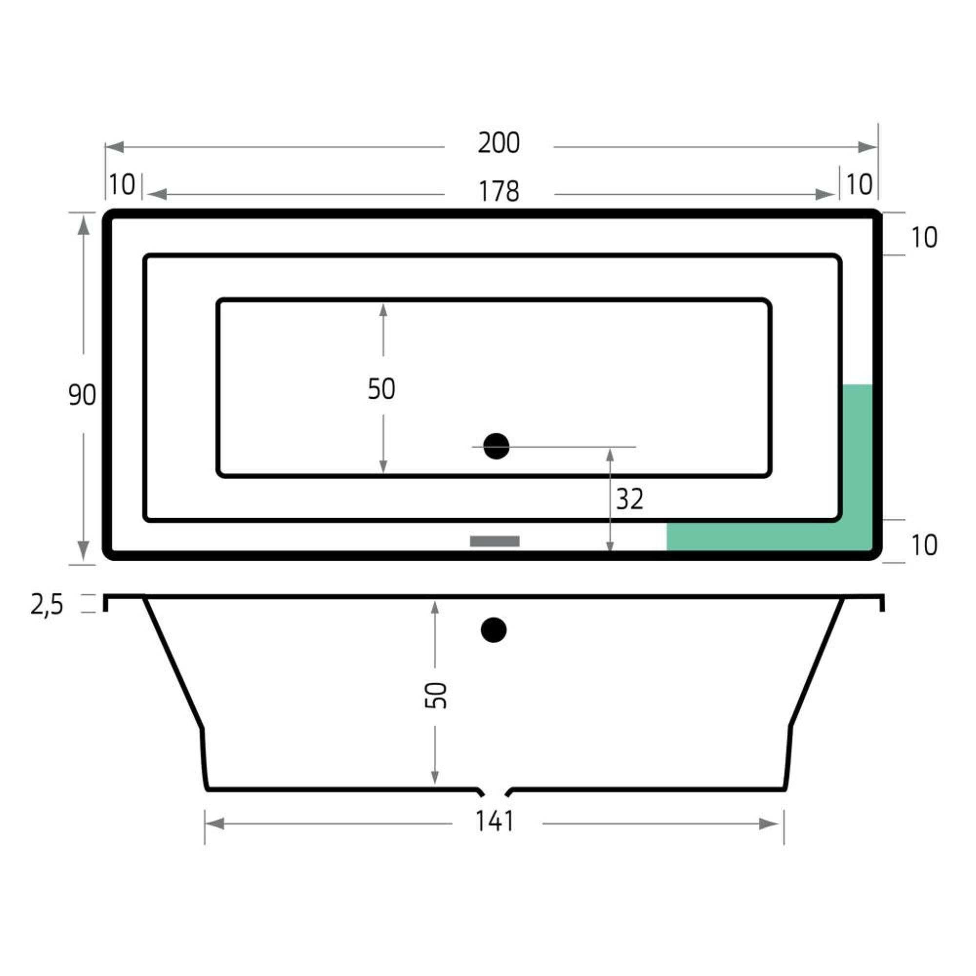 - Grande baignoire duo de 200x90x53 cm pour se baigner confortablement seul ou à deux.