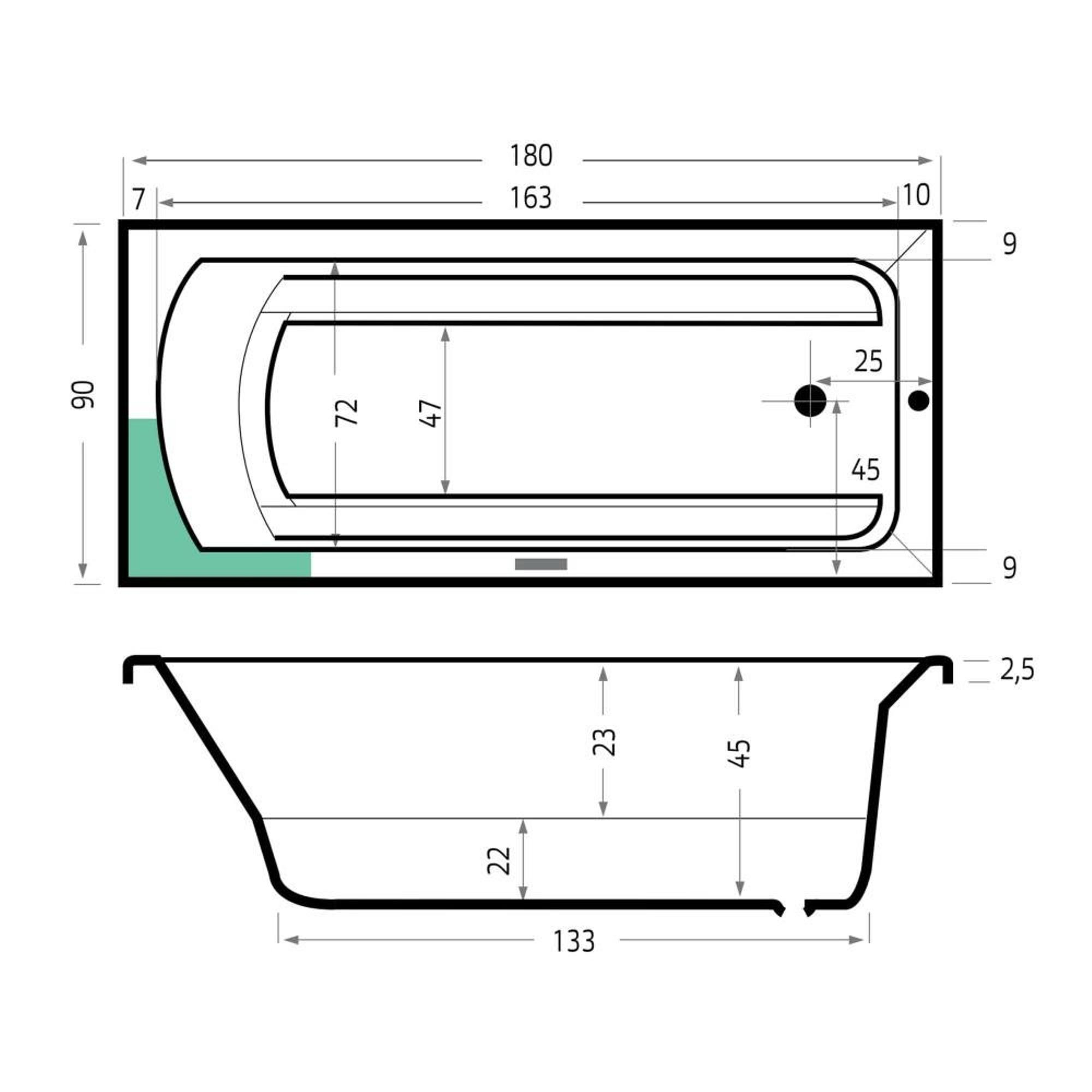 - Baignoire spacieuse de 180x90 cm avec espace intérieur généreux pour s’allonger confortablement.