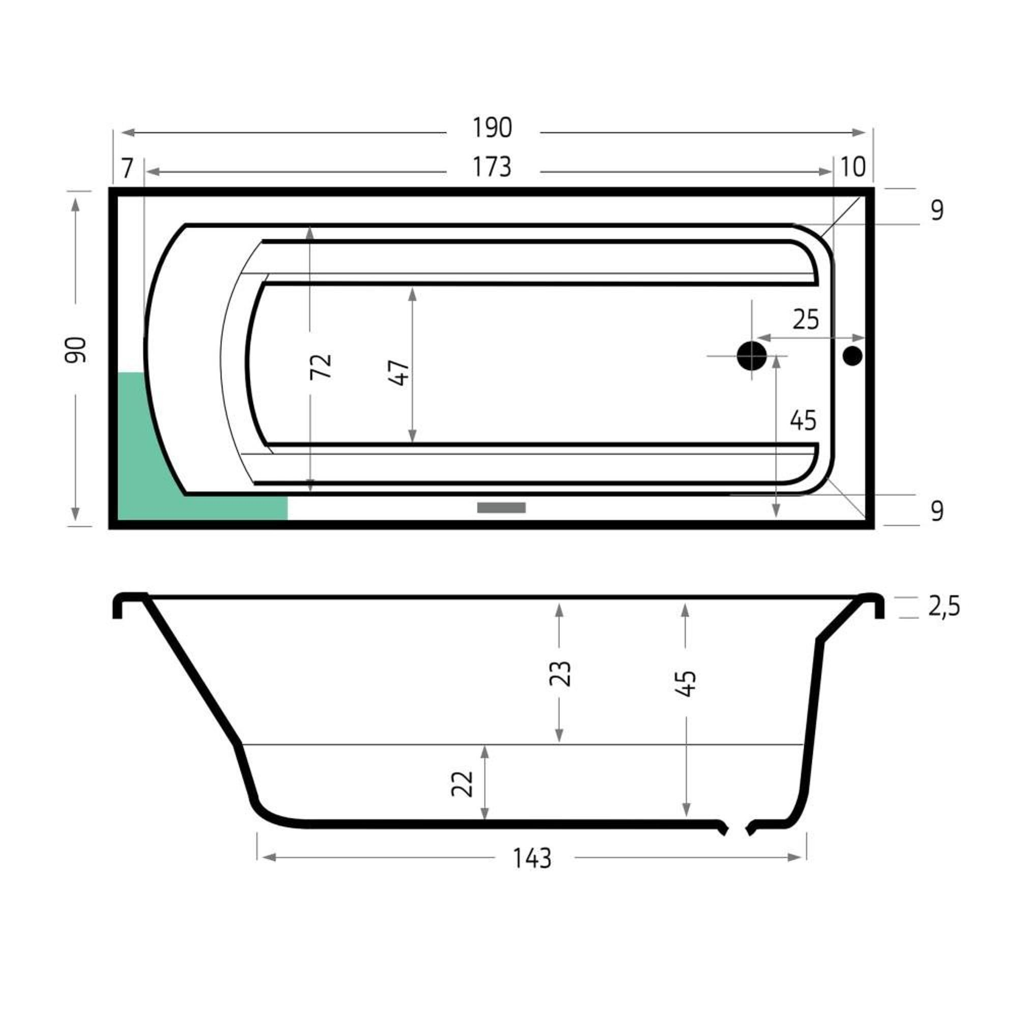 - Baignoire spacieuse de 190x90x48 cm, idéale pour s’allonger confortablement.