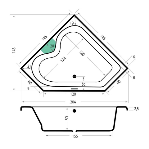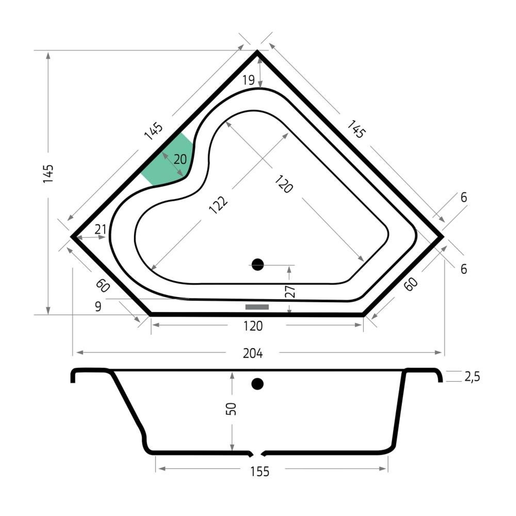 - Baignoire d'angle spacieuse de 145x145 cm, idéale pour les salles de bains de taille moyenne et les grandes salles de bains.