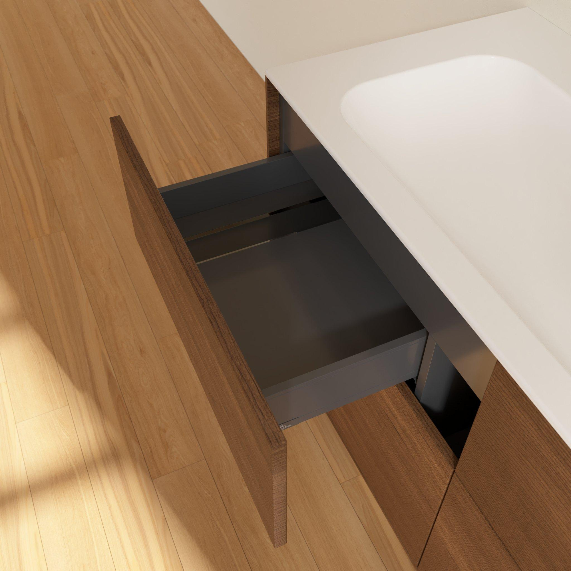 Le confort d’utilisation de ce meuble se remarque à chaque contact. Les tiroirs sans poignées s’ouvrent par une légère pression du doigt sur la façade grâce à la fonction Push-to-Open, idéale lorsque vos mains sont occupées ou mouillées. Pas de poignées saillantes contre lesquelles on se cogne, mais une façade plane et épurée qui dégage une impression de calme. À la fermeture, le système SoftClosing prend le relais : les tiroirs sont automatiquement freinés et se referment tout en douceur, sans coups violents ni bruit. Cela prolonge non seulement la durée de vie du meuble, mais contribue également à une atmosphère silencieuse et détendue dans la salle de bains, par exemple lorsque quelqu’un se lève tôt tandis que les autres dorment encore. Le résultat : un meuble qui s’adapte sans effort à l’utilisation quotidienne de toute la maisonnée.