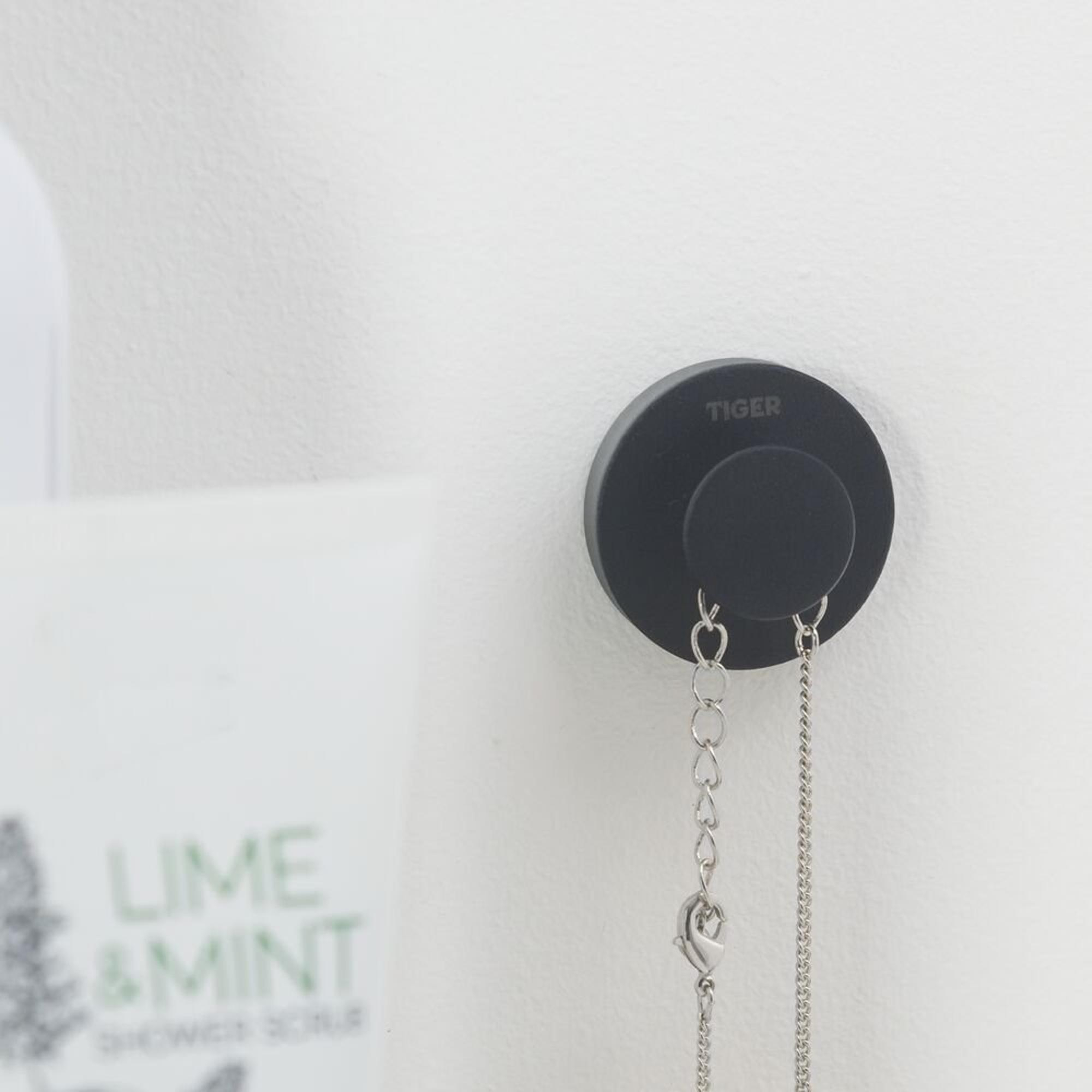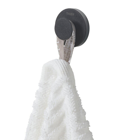 Le dos est muni d'un ruban adhésif double face puissant, ce qui vous permet de monter le crochet rapidement et proprement sur une surface lisse et solide telle que des carreaux, du verre ou des panneaux laqués. Idéal si vous ne voulez pas ou ne pouvez pas percer, ou si vous souhaitez préserver vos carreaux existants sans dégâts. Pour encore plus de facilité de montage, cet accessoire est également adapté à l'utilisation avec TigerFix type 1, un système de colle breveté (vendu séparément) qui permet de fixer vos accessoires de manière extrêmement solide au mur, puis de les retirer facilement plus tard sans laisser de traces. Vous conservez ainsi une liberté maximale pour adapter l'agencement de votre salle de bains à l'avenir, tout en ayant dès maintenant une fixation solide et sûre.