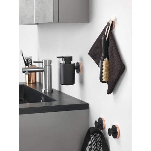 Grâce aux anneaux décoratifs fournis en cuivre et en gris, vous jouez facilement avec l'apparence. Utilisez l'anneau cuivré pour ajouter de la chaleur et une touche de luxe à un robinet ou à une douche noire, ou choisissez l'anneau gris si vous souhaitez créer une ambiance robuste et industrielle. Vous préférez un ensemble épuré et intemporel ? Montez alors le crochet sans anneau, afin que la couleur noir mat soit pleinement mise en valeur. Grâce à son design compact et rond, il semble subtil mais bien pensé : suffisamment grand pour maintenir les serviettes en place, suffisamment petit pour ne pas dominer. Vous combinez ainsi design et fonctionnalité d'une manière qui s'harmonise parfaitement avec le reste de votre sanitaire et de vos accessoires.