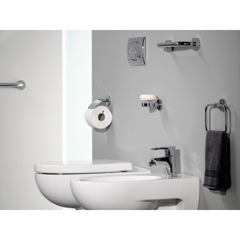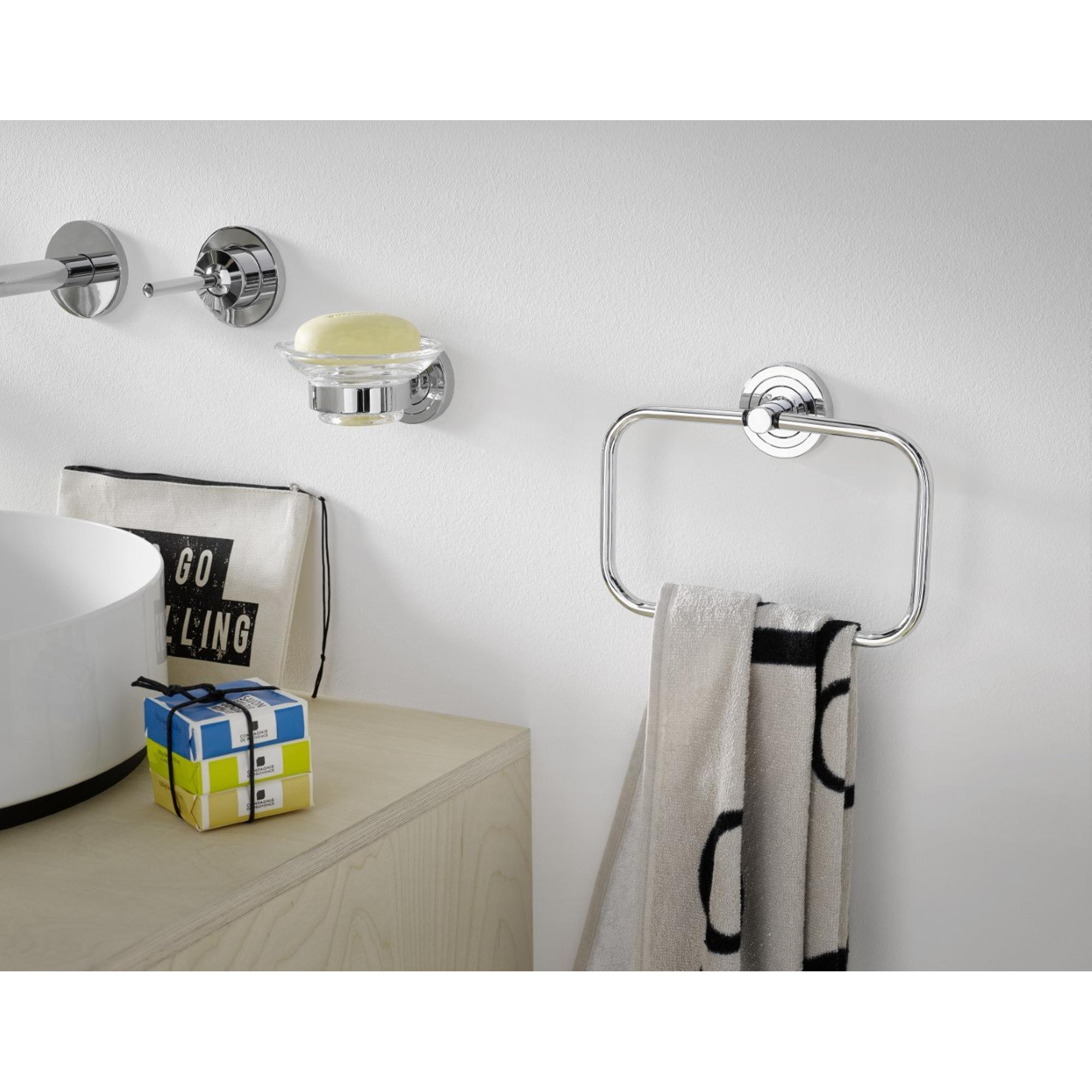 Avec ses dimensions compactes et sa forme ronde, ce porte-savon mural crée immédiatement une impression de calme autour du lavabo. Comme le savon est placé en hauteur, vous conservez plus d’espace pour d’autres accessoires et la salle de bains paraît aussitôt plus ordonnée. Les lignes modernes et épurées s’harmonisent parfaitement avec les robinets et accessoires de salle de bains contemporains, en particulier dans un intérieur comportant beaucoup d’accents chromés ou brillants. La coupelle en verre transparent met le savon en valeur et apporte un effet léger et luxueux, sans être criard. Vous ajoutez ainsi subtilement un détail de qualité qui procure du plaisir à l’usage jour après jour.