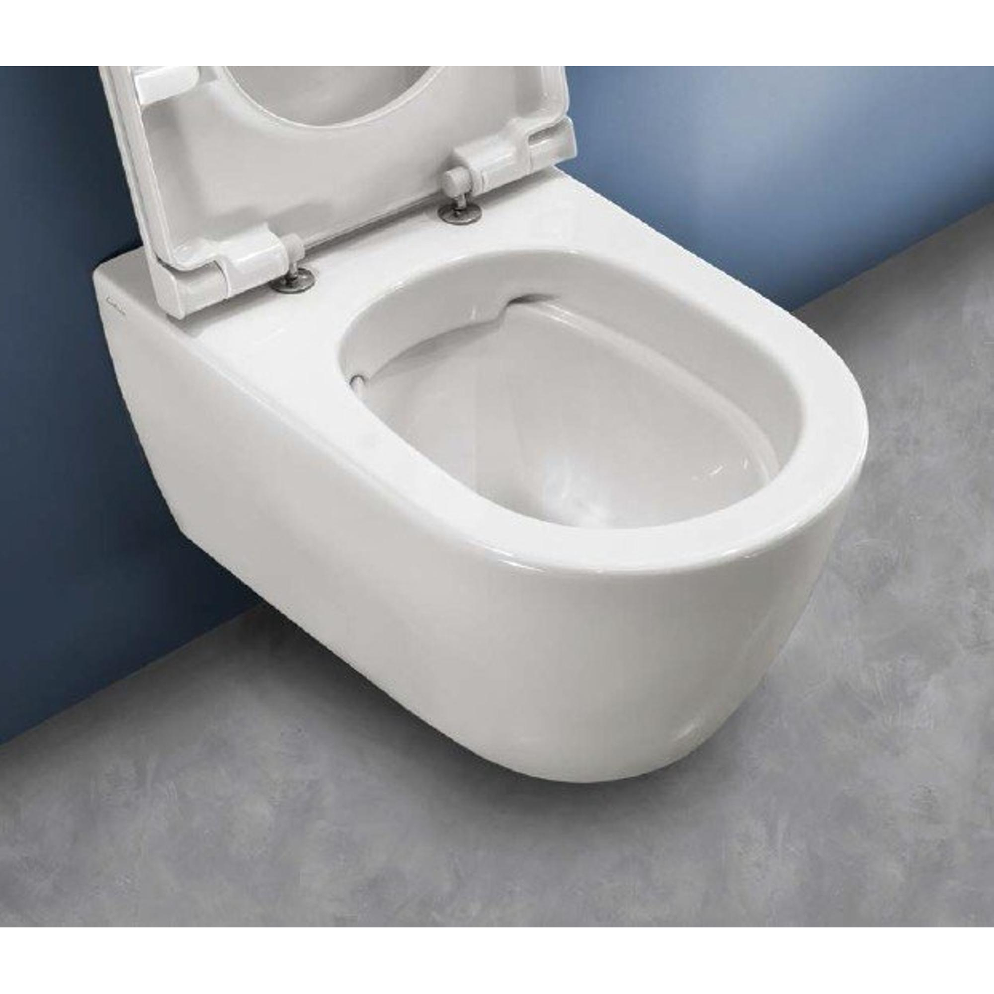 - WC en céramique sans bride pour une hygiène optimale et un nettoyage aisé.