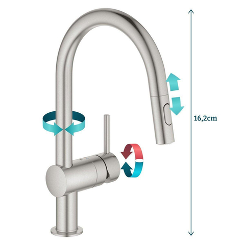 GROHE Minta Robinet de cuisine - haut - bec pivotant/extensible - 2 types de jets - supersteel brossé