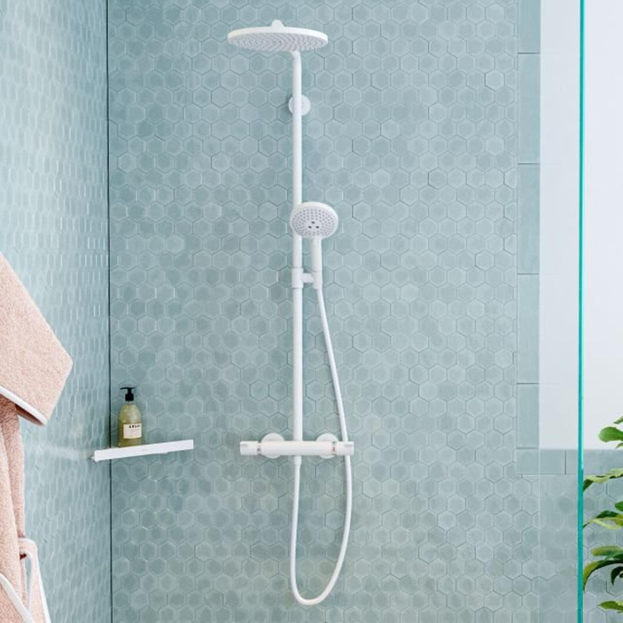 Ce système de douche est fabriqué à partir de matériaux de haute qualité garantissant une longue durée de vie et une fiabilité optimale. Le revêtement blanc mat est non seulement esthétique, mais aussi résistant aux rayures et à la décoloration, ce qui permet au système de conserver son aspect neuf pendant des années. Grâce aux picots en silicone QuickClean, vous éliminez facilement le calcaire d'un simple passage sur la pomme de douche, ce qui facilite et accélère l'entretien. De plus, le thermostat assure une température d'eau stable, ce qui est non seulement confortable, mais aussi sûr, grâce à la SafetyStop intégrée qui empêche l'eau de devenir trop chaude.