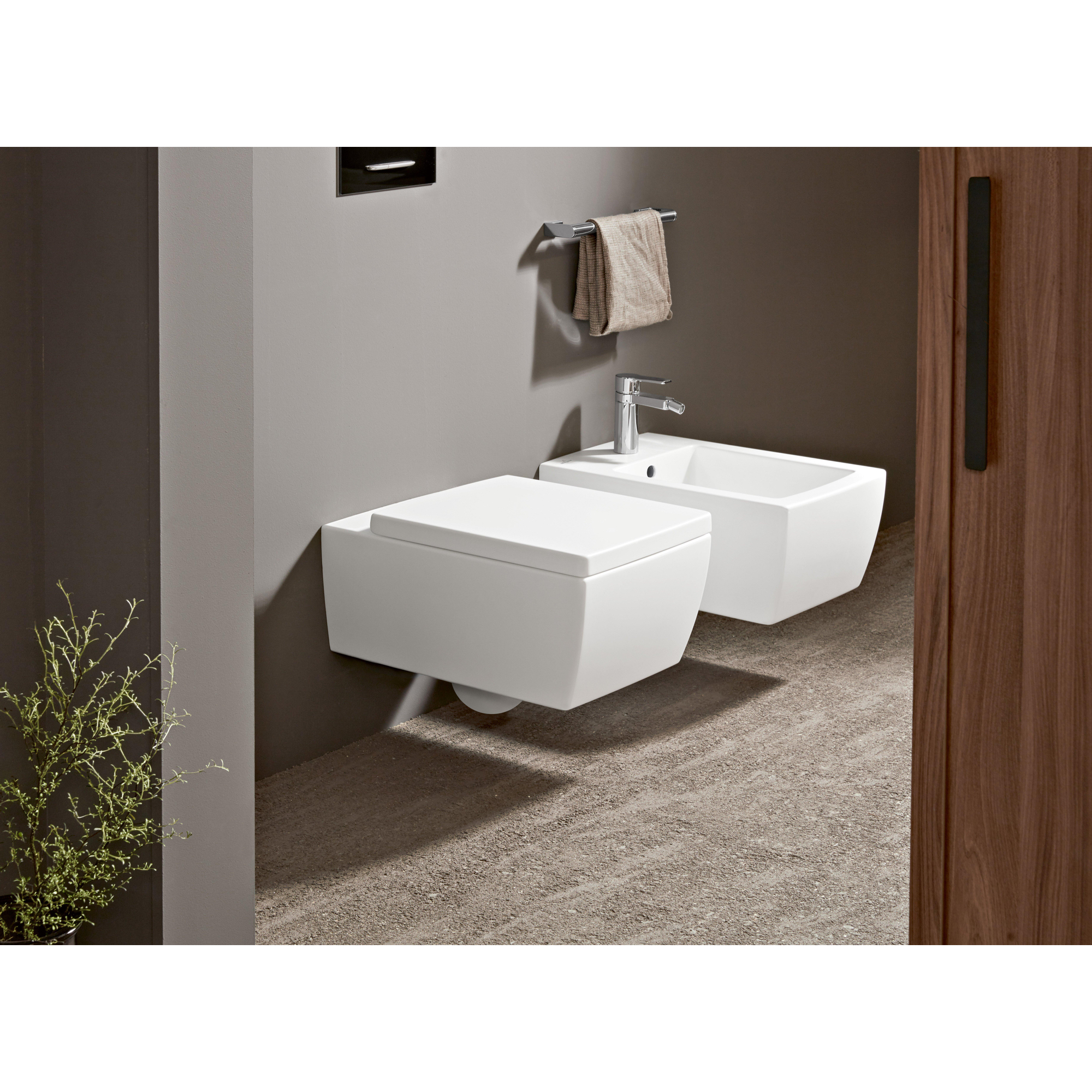 Les lignes épurées et la forme rectangulaire confèrent à ce WC suspendu une apparence presque architecturale, ce qui lui permet de s’intégrer parfaitement dans les salles de bains modernes et axées sur le design. La couleur stone white apporte une touche douce et chic qui se marie à merveille avec des matériaux naturels comme le bois et la pierre, mais aussi avec des robinets noirs ou chromés. Comme le WC est monté de façon suspendue, le sol reste dégagé et l’espace paraît visuellement plus grand et plus ordonné. Vous créez ainsi facilement des toilettes ou une salle de bains apaisantes où chaque détail est étudié, de la céramique au mur jusqu’au carrelage au sol.