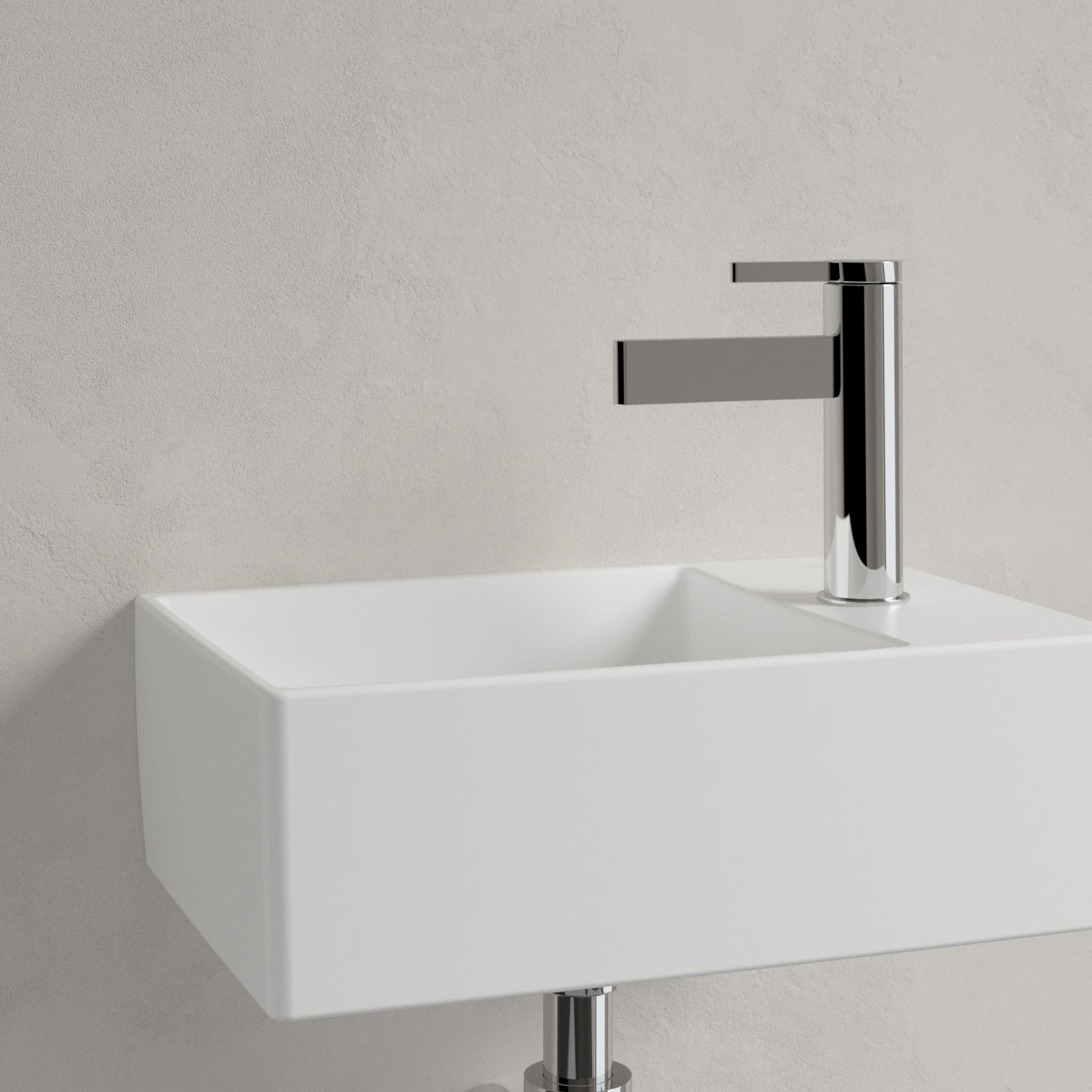 Avec un format de 40x26 cm, ce lave-mains est idéal pour les petits WC et les salles de bains étroites, sans compromis sur le confort. La position du robinet sur le côté permet d’utiliser de manière optimale l’espace dans la cuve et de réduire les éclaboussures à l’avant. La forme rectangulaire offre une apparence épurée et ordonnée, ce qui rend la pièce plus calme et visuellement plus grande. Grâce à la faible hauteur, le lave-mains est en outre agréable à utiliser pour les jeunes comme pour les moins jeunes. Ce modèle est spécialement conçu pour le lavage des mains et les courts moments de soins, ce qui en fait un excellent choix pour les blocs sanitaires, les salles d’eau pour invités ou les appartements citadins compacts.