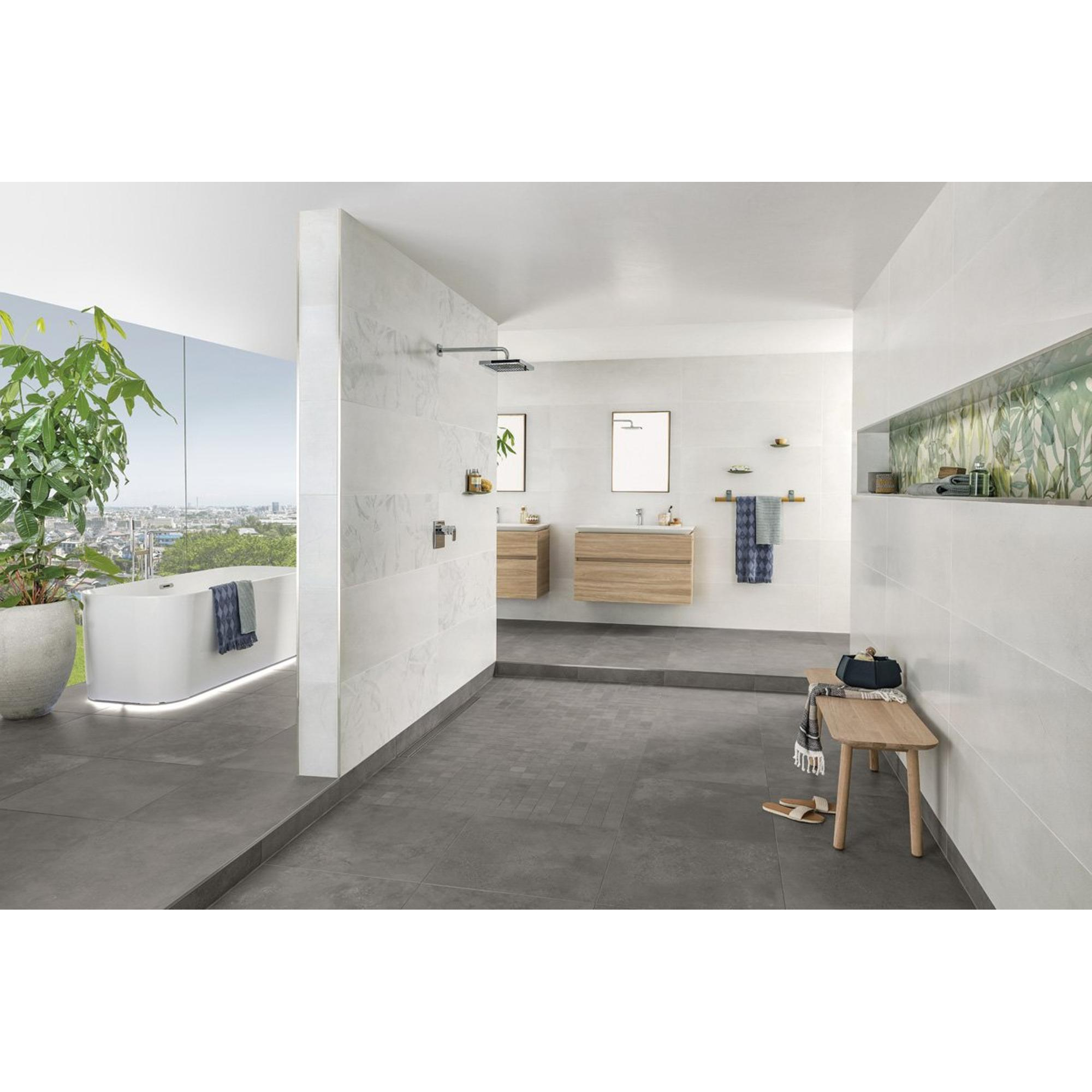 Avec son format généreux de 60x60 cm et ses bords rectifiés (droits), vous créez un sol épuré, presque sans joints. Les joints peuvent être maintenus étroits, ce qui donne à votre salle de bains, WC ou pièce de vie une apparence plus spacieuse et plus calme. La couleur grise se marie parfaitement avec la robinetterie et la céramique blanches, les accents noirs ou les tons bois chauds, ce qui vous permet de composer facilement un intérieur intemporel qui peut évoluer avec les tendances. En choisissant ce carreau, vous optez pour une base stable : un sol dont on ne se lasse pas rapidement et que vous pouvez facilement personnaliser avec des accessoires, des meubles et un éclairage.