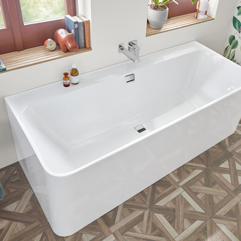 Cette baignoire semi-autoportante offre un compromis astucieux : le look d’une baignoire autoportante, mais avec une perte de place moindre. Comme un des côtés longs est placé contre le mur, vous conservez davantage d’espace de circulation dans une salle de bains moyenne ou compacte, tout en profitant d’un véritable point de mire au cœur de la pièce. La forme rectangulaire épurée, avec des bords fins et délicats, donne une impression de légèreté et de raffinement, ce qui fait paraître la salle de bains visuellement plus spacieuse. Le large rebord longitudinal peut en outre être utilisé de manière fonctionnelle et décorative, par exemple pour vos produits de soin, un verre d’eau ou quelques bougies pour un moment bien-être à domicile. Vous créez ainsi facilement un ensemble élégant et apaisant, sans que votre salle de bains ne paraisse surchargée.
