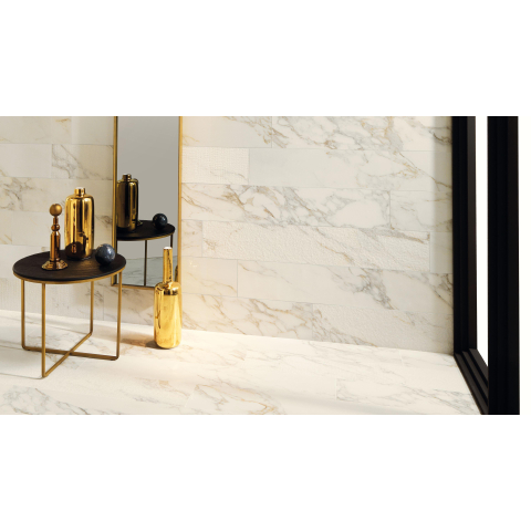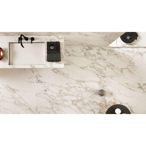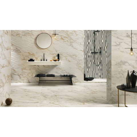 La teinte Calacatta confère immédiatement à votre intérieur une atmosphère exclusive et raffinée, sans la fragilité ni l’entretien du vrai marbre. Le dessin du carrelage est soigneusement conçu pour se rapprocher de la variation naturelle de la pierre, afin que votre sol ou votre mur ne paraisse pas plat ou « faux », mais au contraire vivant et raffiné. La finition mate offre un aspect moderne et apaisant et évite les reflets gênants dans les pièces très lumineuses. Ce carrelage se prête donc parfaitement aux grandes salles de bains, suites, mais aussi aux salons et cuisines où vous souhaitez créer un seul sol continu effet marbre. Associez-le à un bois chaleureux, à des équipements sanitaires noirs ou à des accents dorés pour renforcer encore davantage la sensation de luxe.