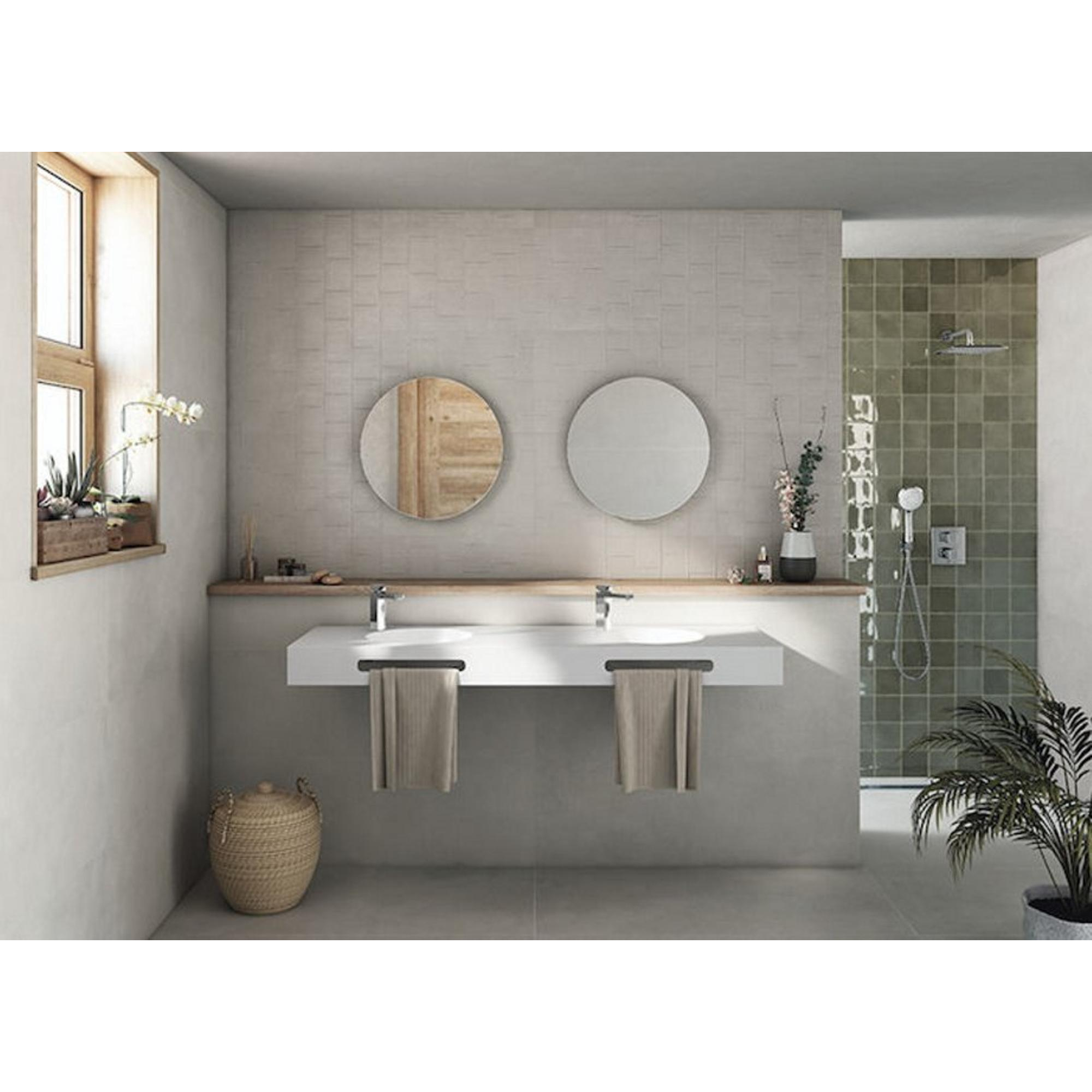 Avec 13x13 cm, ce format est très convivial pour le carreleur et pratique si vous vous mettez vous-même au travail. Les carreaux se laissent facilement poser autour des angles, des niches et des miroirs, de sorte que vous obtenez un résultat net même dans les espaces plus petits ou difficiles. Grâce à la pâte blanche (base claire), le carrelage se combine bien avec des couleurs de joint claires pour un aspect apaisant, ou justement avec un joint contrasté si vous souhaitez faire davantage ressortir le motif. Par boîte, vous couvrez environ un demi-mètre carré, ce qui rend le calcul de la quantité nécessaire clair et idéal si vous ne souhaitez carreler qu’une partie de la pièce.