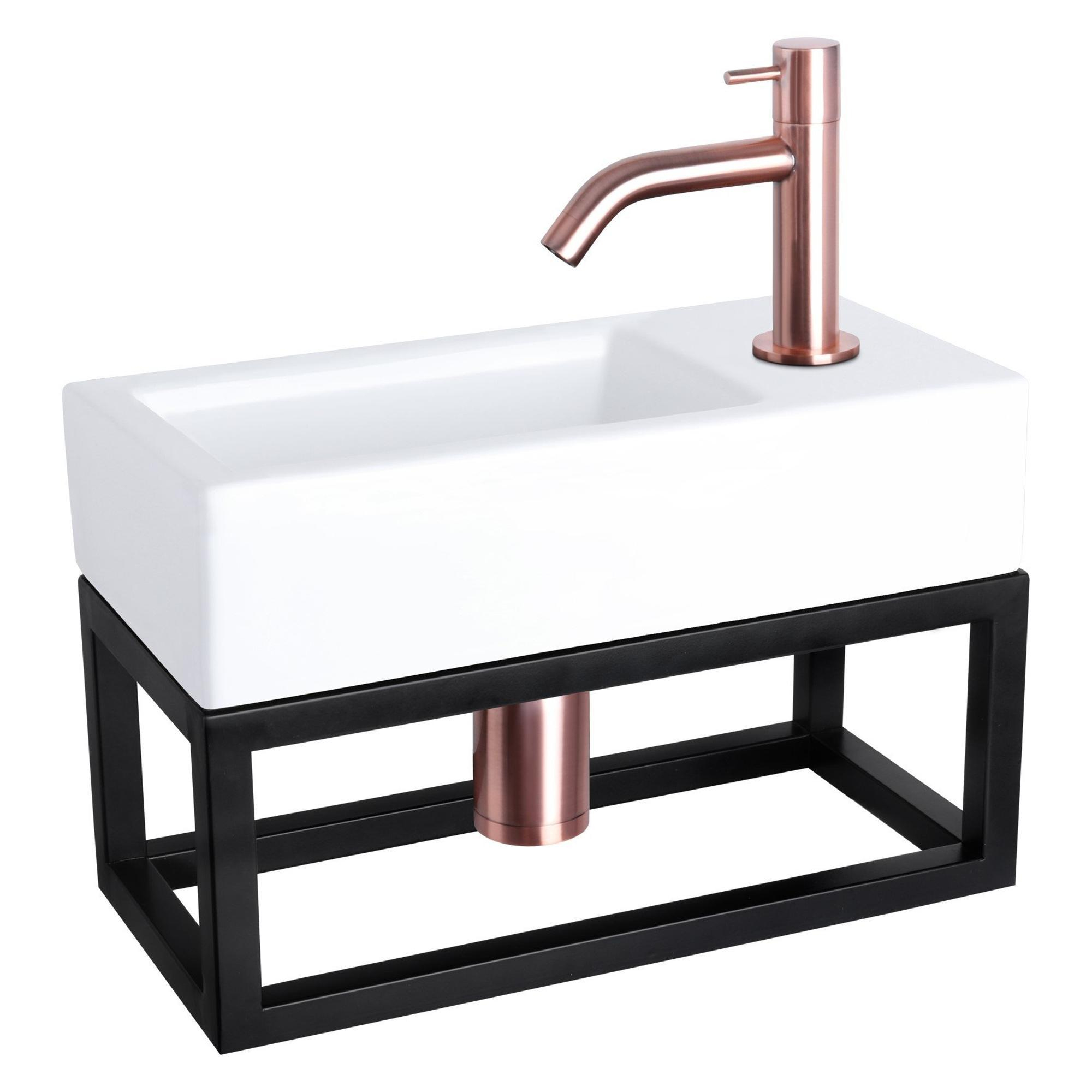 Differnz Ravo Kit lave-mains - 38.5x18.5x25cm - Droit - 1 trou de robinet - Robinet en cuivre courbé - avec cadre noir - Céramique Blanc
