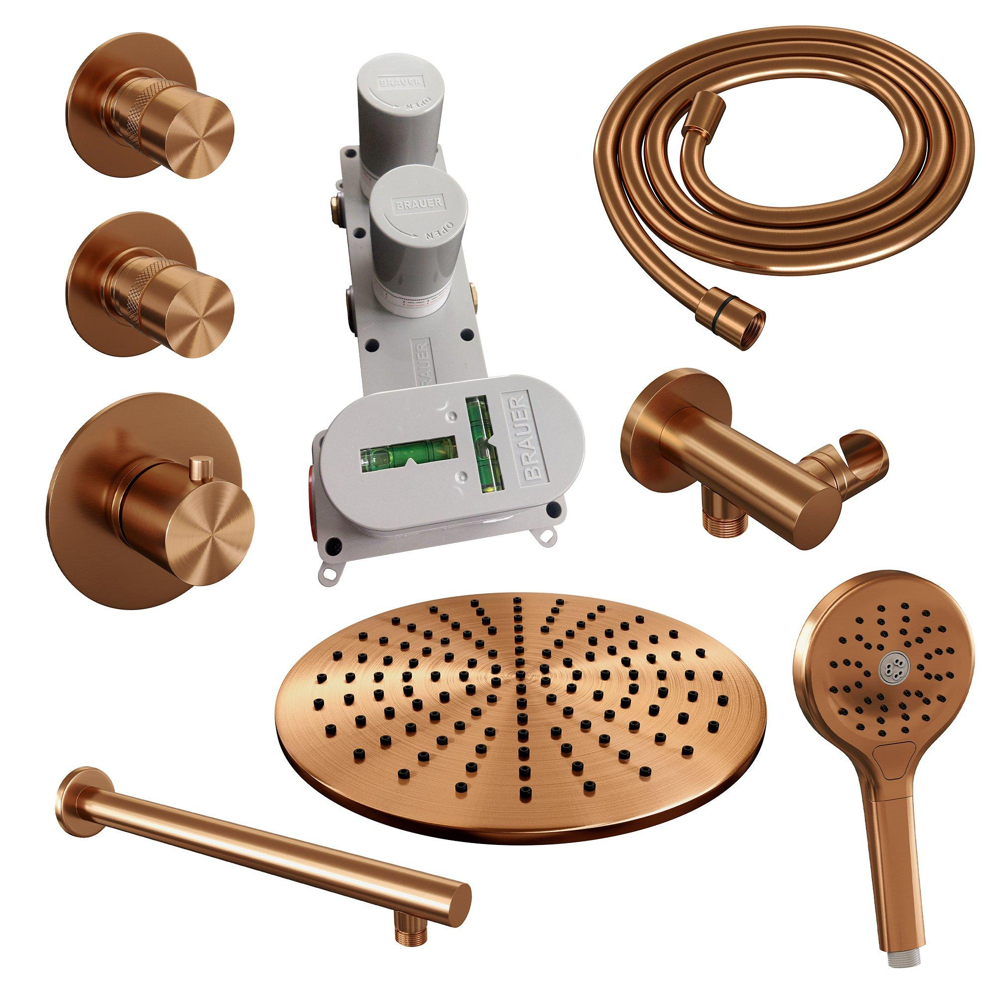 Brauer Copper Edition Ensemble de douche pluie encastré - douche principale 30cm - 3 boutons lisses - bras mural droit - douchette ronde 3 positions - PVD - cuivre brossé