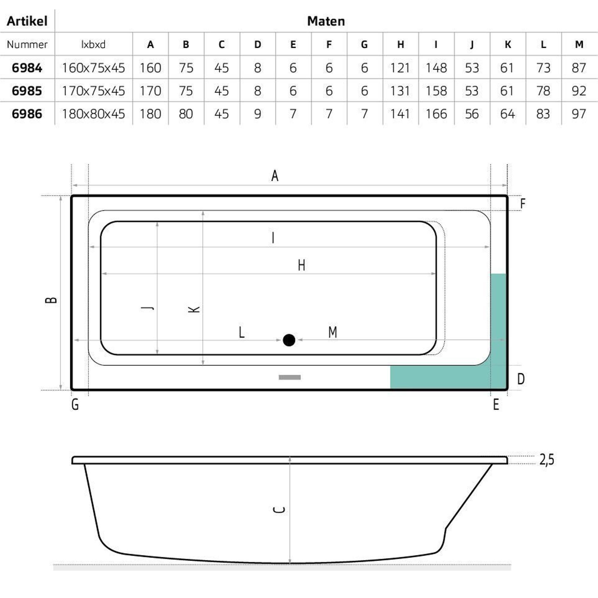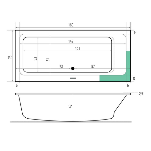 Avec des dimensions de 160x75x48 cm, cette baignoire offre une position allongée étonnamment spacieuse, tout en s’intégrant facilement dans de nombreuses salles de bains. La forme rectangulaire et la conception intelligente de l’intérieur permettent d’optimiser l’espace disponible et de s’allonger confortablement, même si vous êtes un peu plus grand. La profondeur est suffisante pour profiter d’un bain bien rempli, afin que vos épaules disparaissent sous l’eau et que vous puissiez vraiment vous détendre. Grâce à la bonde centrale, vous pouvez en outre choisir librement de quel côté vous souhaitez vous allonger, ce qui rend la baignoire particulièrement polyvalente. C’est donc une solution idéale si vous souhaitez une véritable baignoire allongée sans pour autant disposer de la place pour un modèle extra-long.