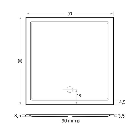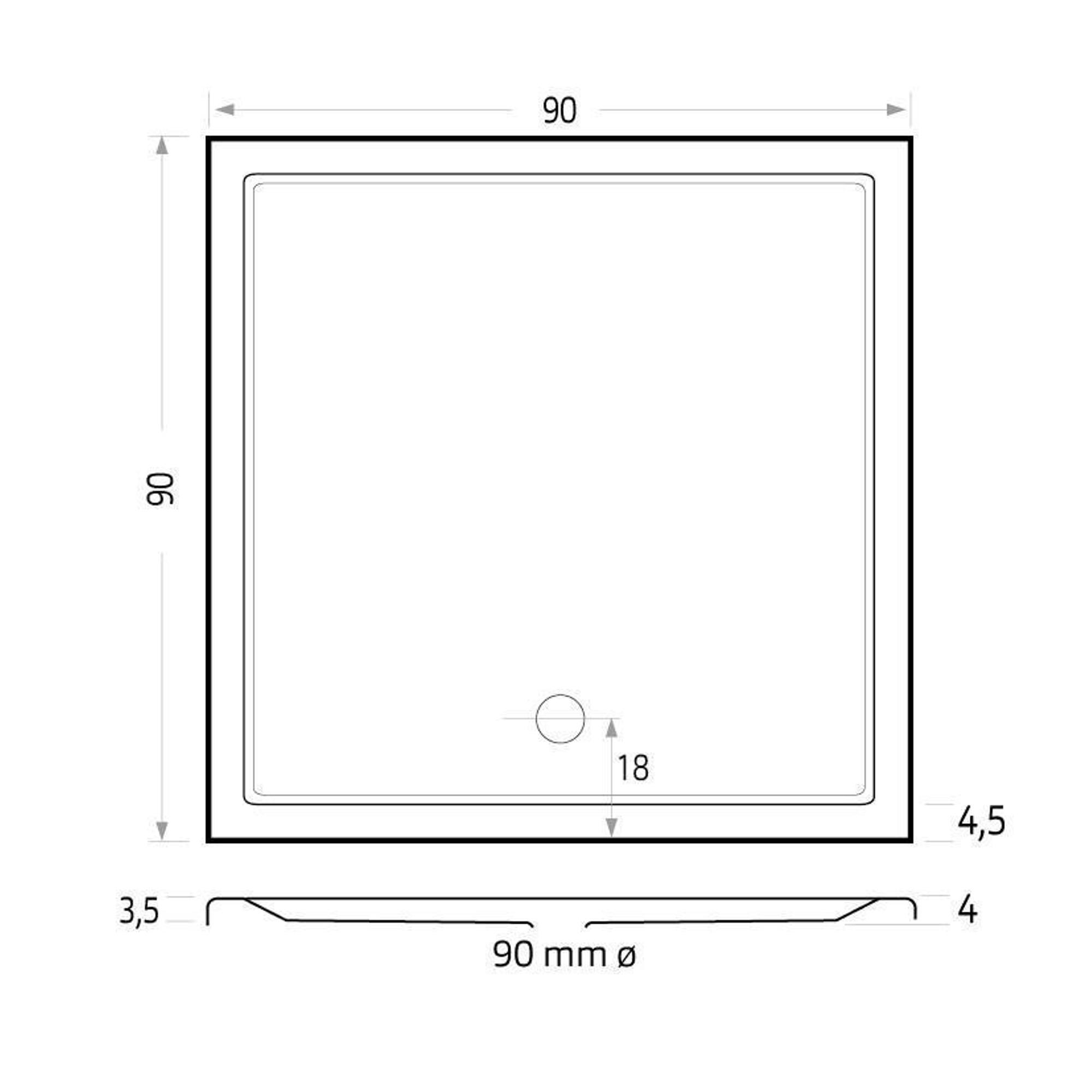 - Receveur de douche carré de 90x90 cm, idéal pour des espaces douche confortables mais compacts.