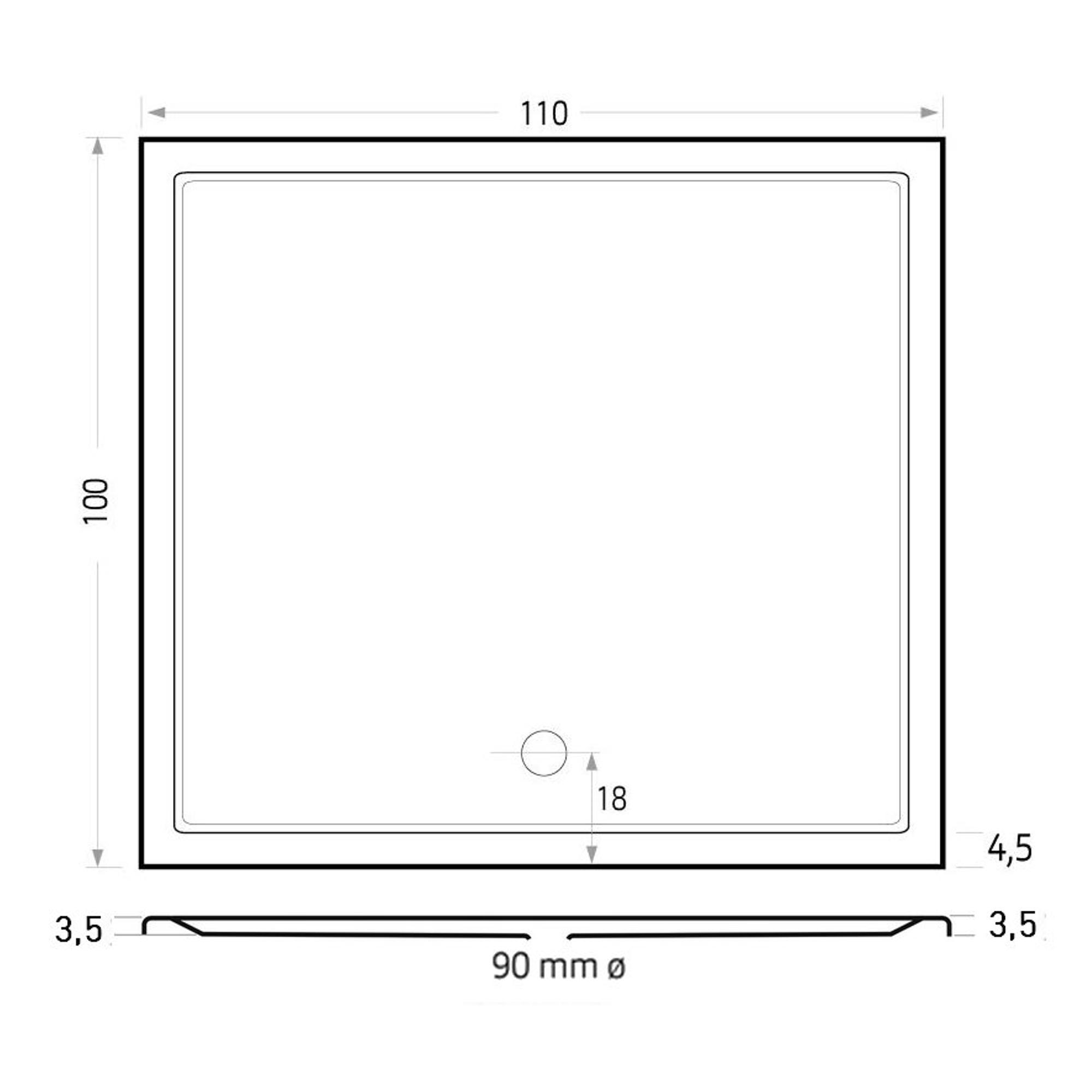 - Receveur de douche rectangulaire spacieux de 110x100 cm pour une plus grande liberté de mouvement sous la douche.