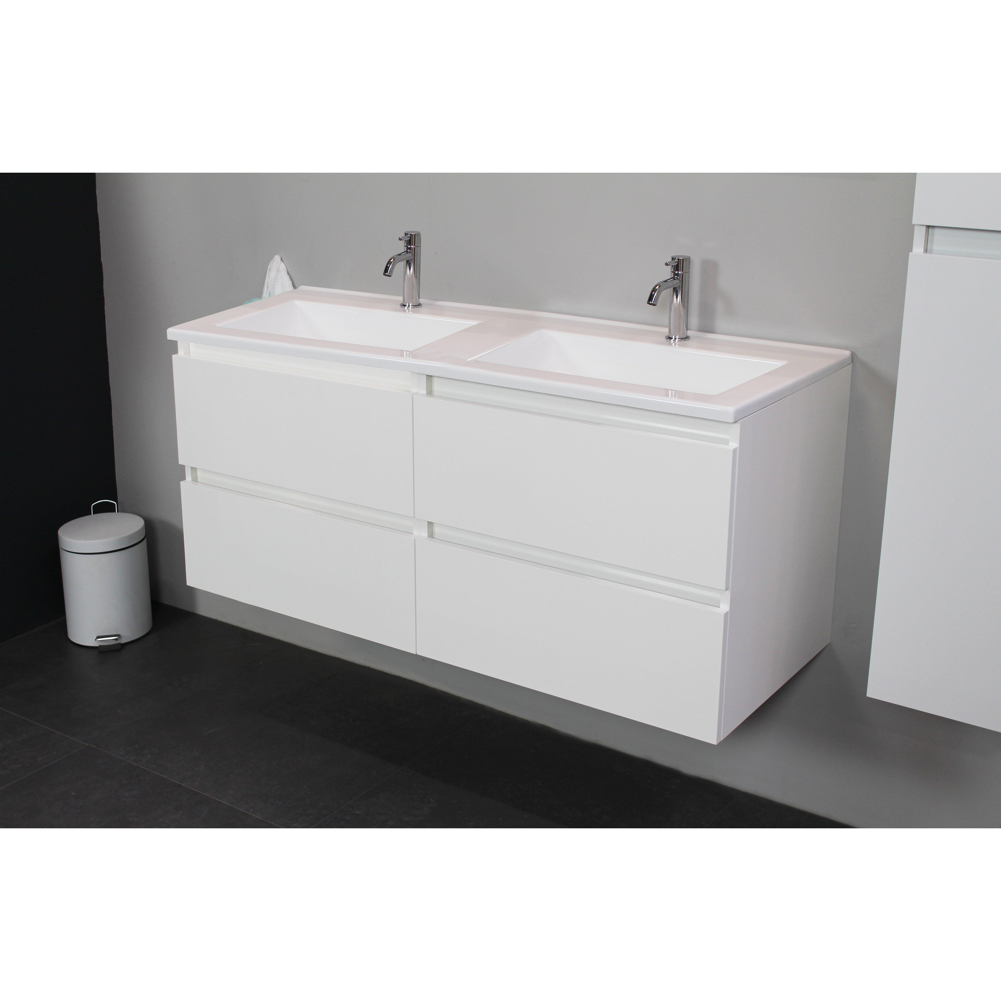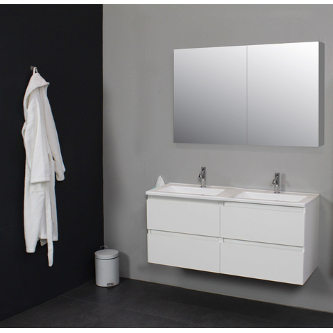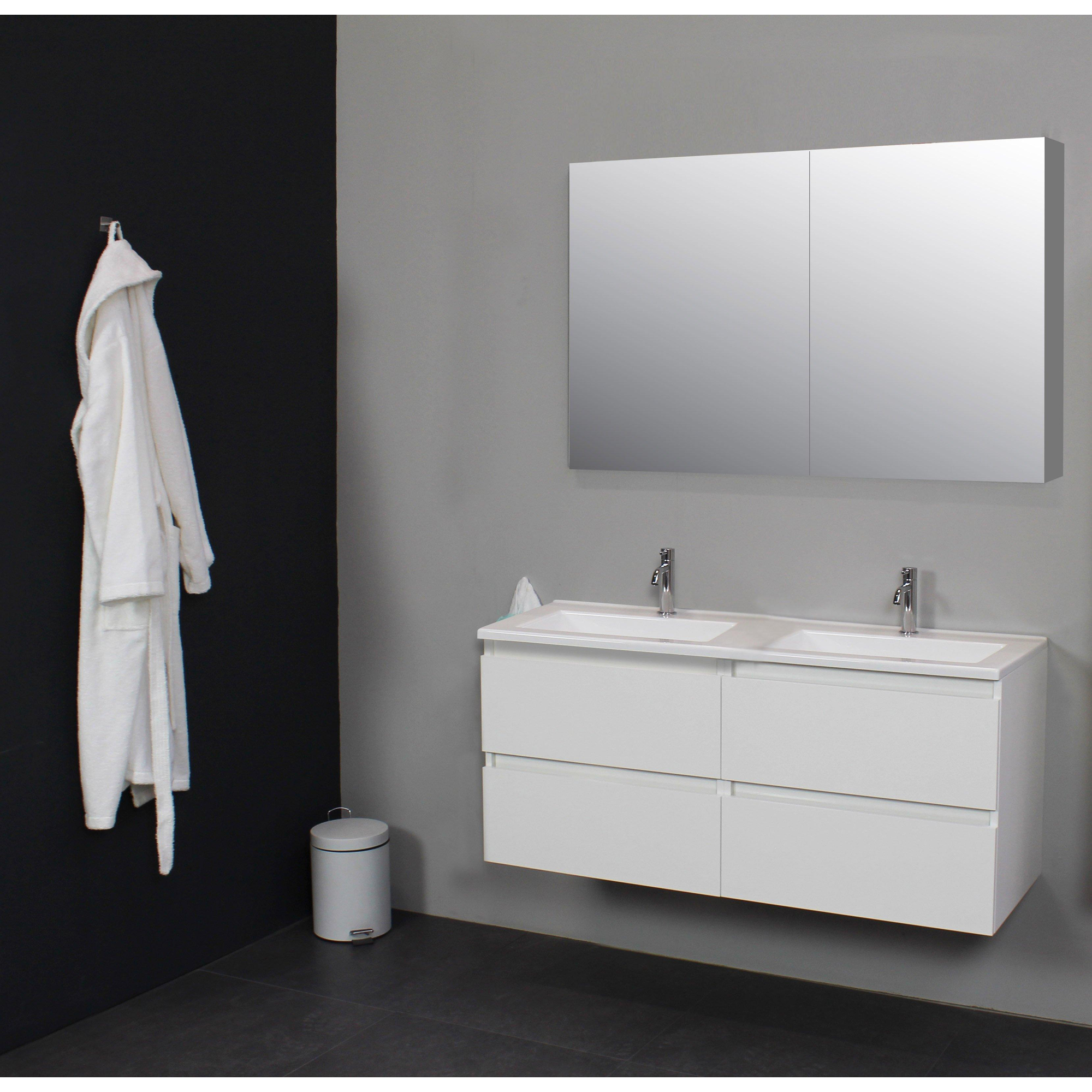 Basic Bella Ensemble meuble de salle de bains - 120x55x46cm - 2 lavabos - Acrylique - Blanc - 2 trous de robinet - Armoire miroir sans éclairage - Mélamine blanc brillant