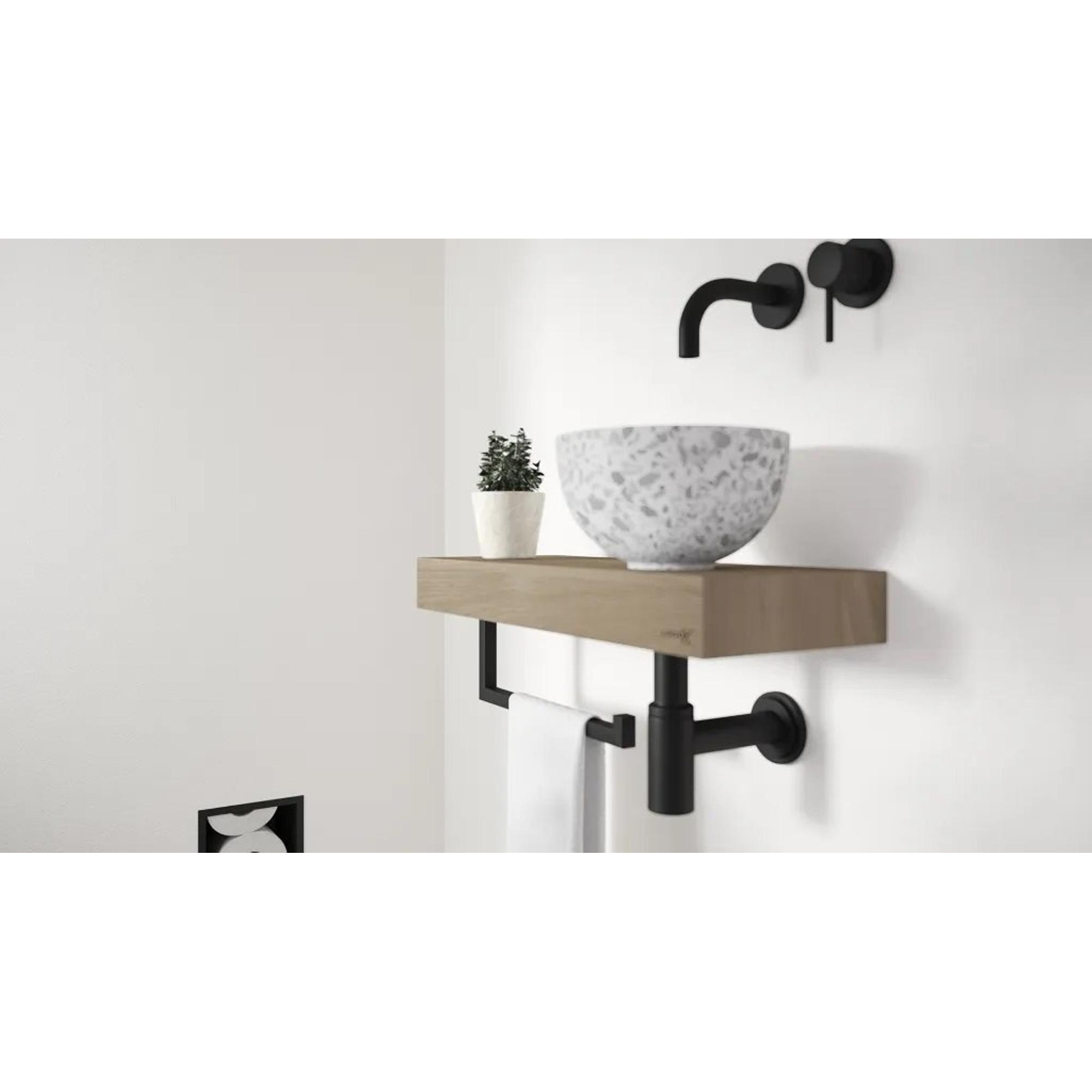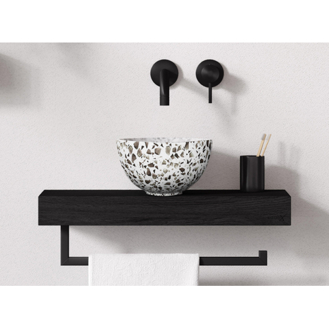L’aspect terrazzo noir moucheté donne immédiatement du caractère à vos toilettes. Les subtils petits points à la surface créent un effet ludique et naturel qui se marie à merveille avec des carreaux clairs comme foncés. Dans une salle de bains moderne, industrielle ou style hôtel chic, cette vasque révèle tout son potentiel. Associez-la à des robinets et accessoires noirs, en inox ou laiton brossé pour un ensemble luxueux. Comme chaque motif terrazzo est légèrement différent, votre espace lave-mains paraît unique et personnel. Vous transformez ainsi un lieu souvent oublié en une entrée surprenante pour vous et vos invités.
